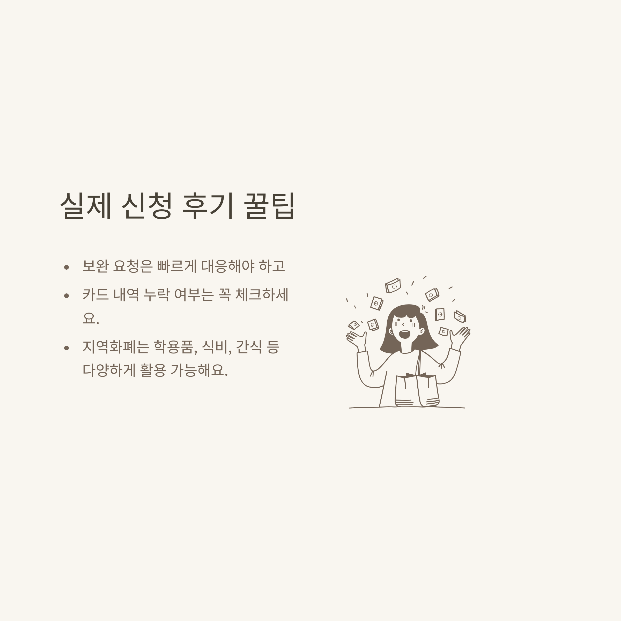실제로 저는 동네 카페와 학원비, 문구점 등에서 쓸 수 있어서 용돈처럼 활용했습니다. 지급일에 맞춰 알림 문자가 오고, 모바일 앱으로 잔액과 사용내역을 쉽게 확인할 수 있었던 점도 편리했습니다.