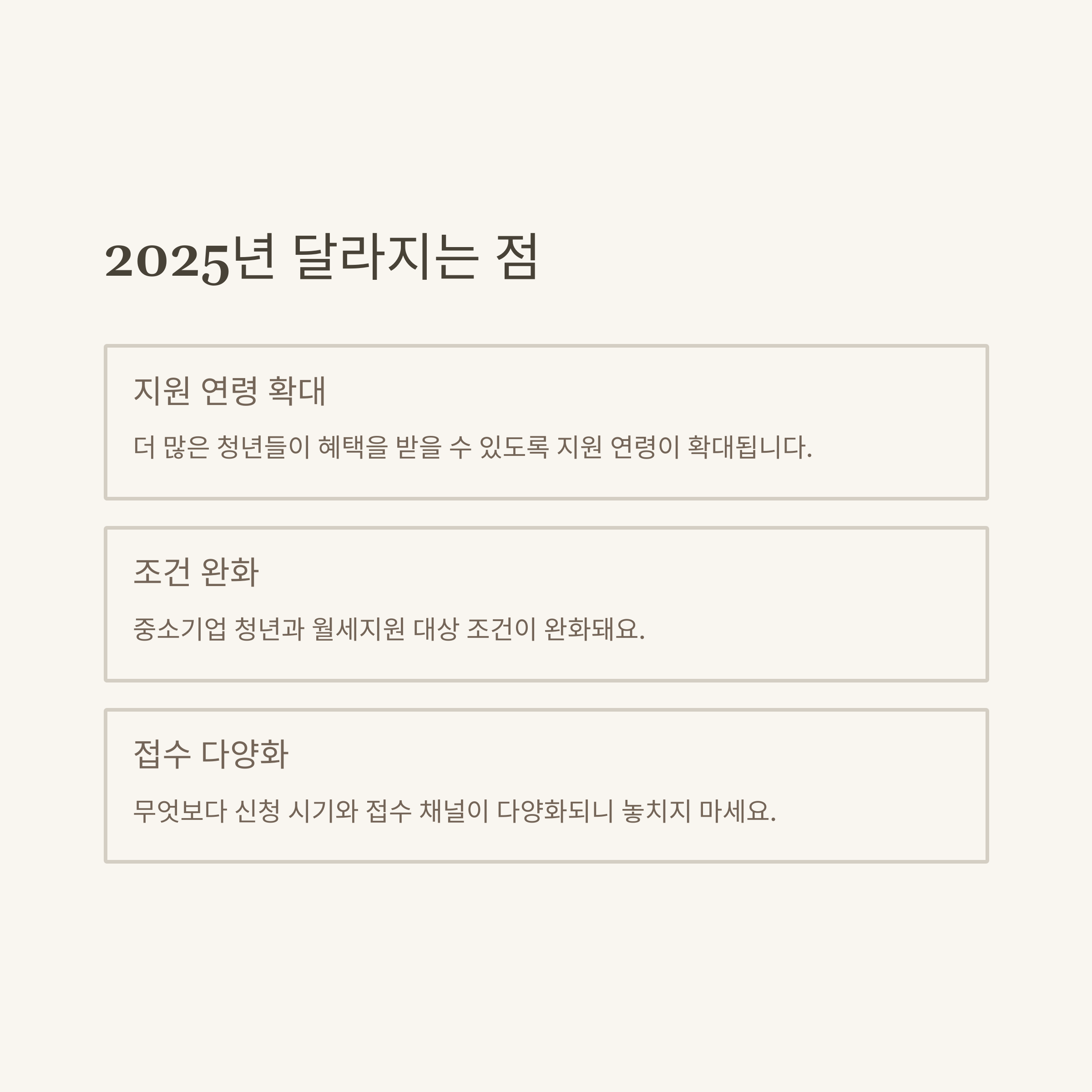 2025년에는 기존보다 지원대상 연령이 확대되거나, 일부 자격 조건이 완화되는 방향으로 조정이 예고되고 있습니다. 특히 경기도 중소기업 취업 청년의 경우, 근속기간 조건 완화, 월세지원금의 소득 기준 상향 등이 대표적입니다.