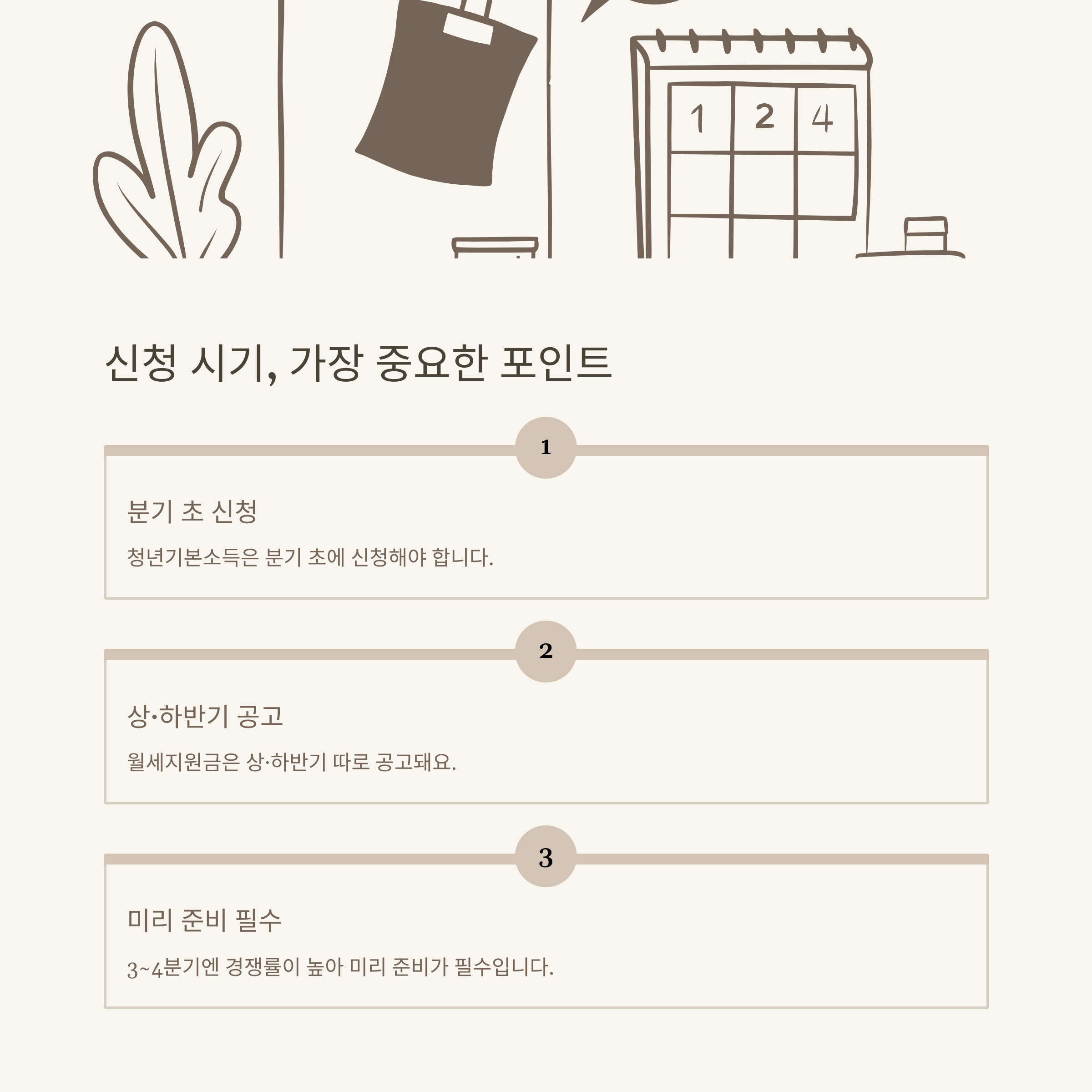 예를 들어, 청년기본소득은 각 분기 초에 신청 접수가 시작되고, 청년월세지원금은 주로 상반기, 하반기 공고로 나누어집니다. 특히 3분기, 4분기는 하반기 공고와 맞물려 경쟁률이 높아지는 경향이 있습니다.