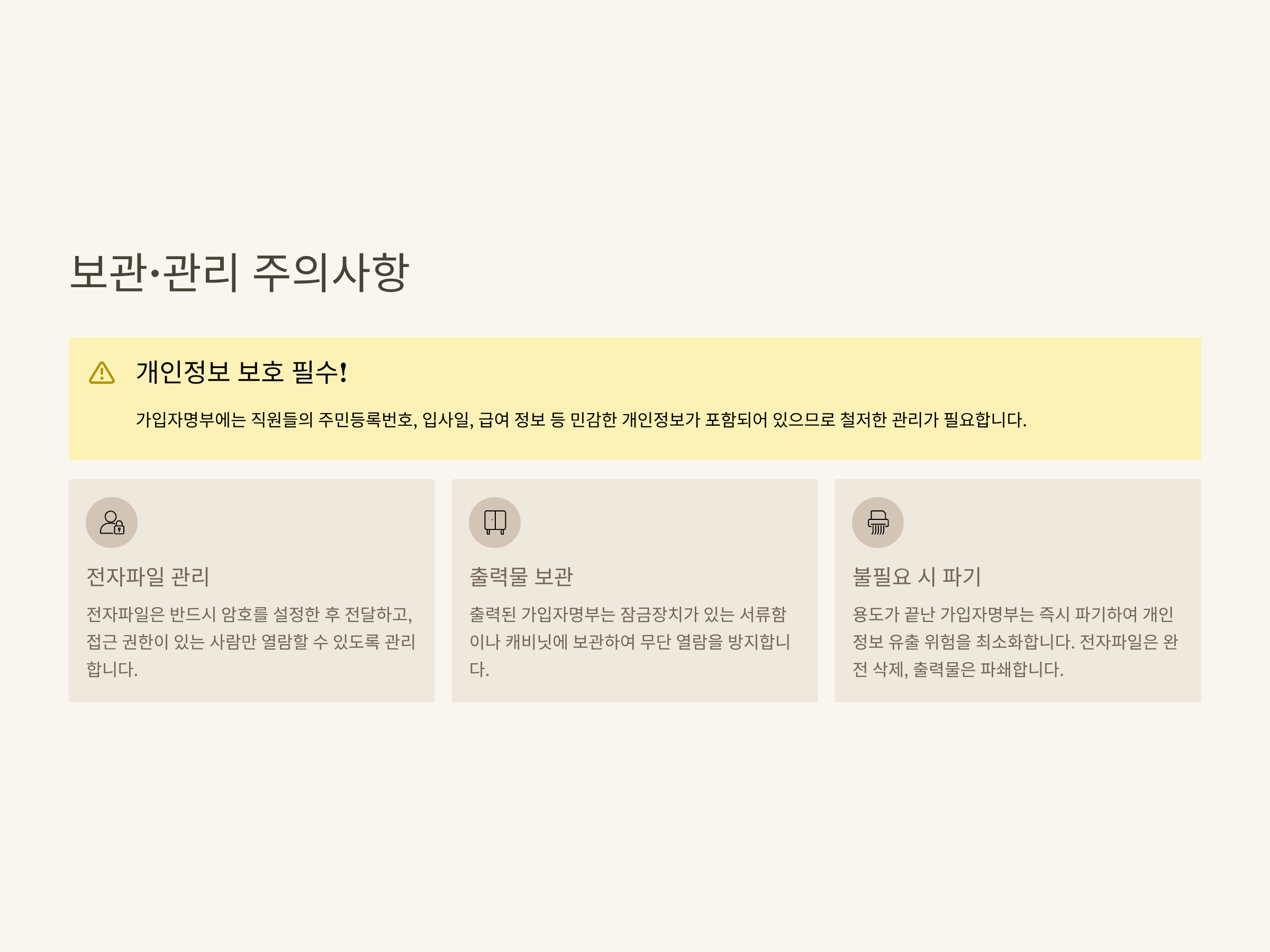고용보험 가입자명부에는 직원들의 주민등록번호, 입사일, 고용 형태 등 개인정보가 포함됩니다. 저는 처음 발급받았을 때 이메일로 그대로 보내버렸다가, 나중에 보안 위험성을 인지하고 암호화 압축 후 전달하는 습관을 들였습니다. 또한, 종이로 출력된 경우에는 잠금 서랍이나 금고에 보관하는 것이 안전합니다.