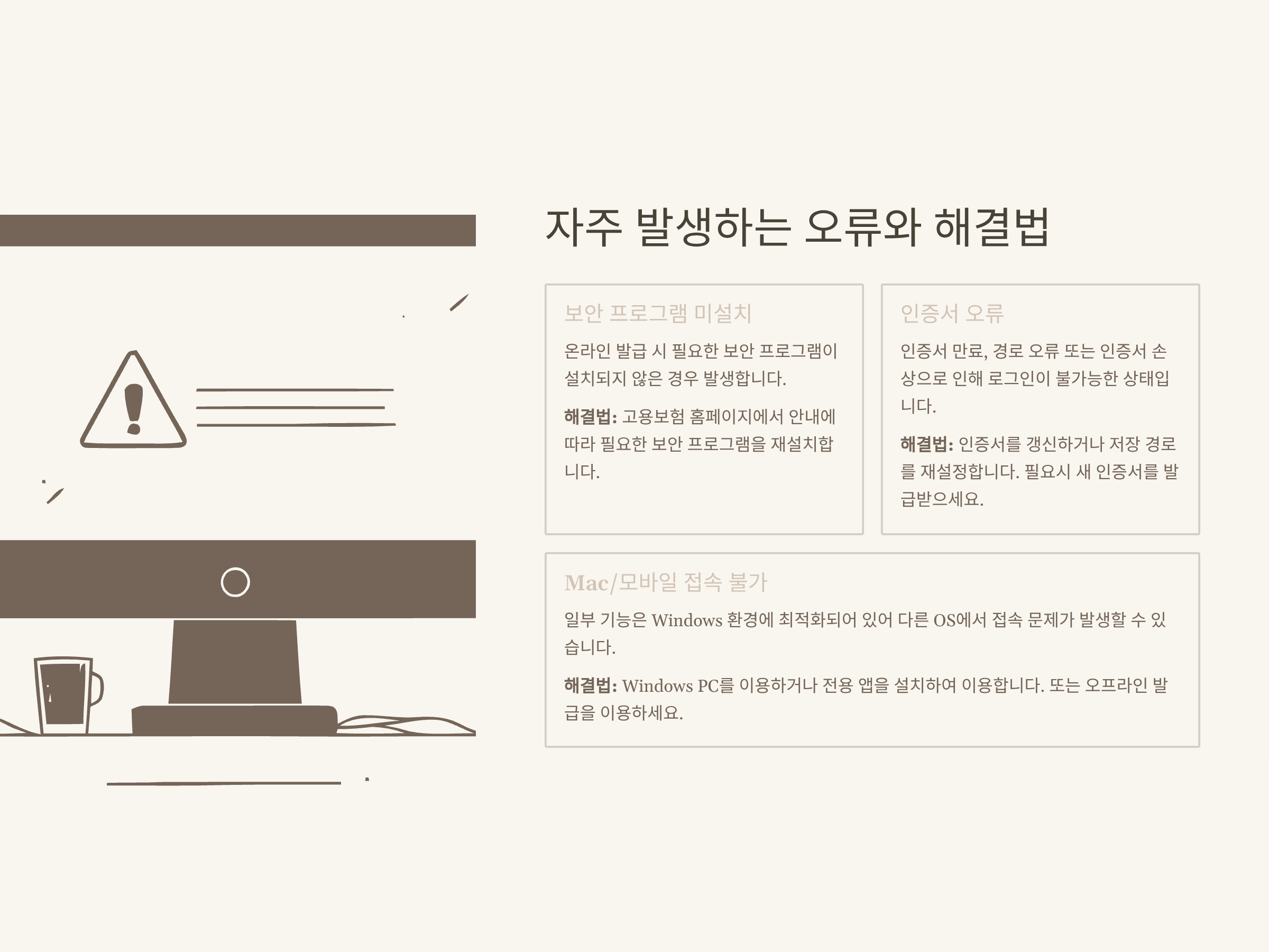 제가 가장 많이 겪은 오류는 ‘보안 프로그램 미설치’와 ‘인증서 유효하지 않음’이었습니다. 특히 MacOS에서는 인터넷 익스플로러 환경이 없어 접속이 어려웠습니다. 이럴 땐 아래 방법으로 해결할 수 있습니다.