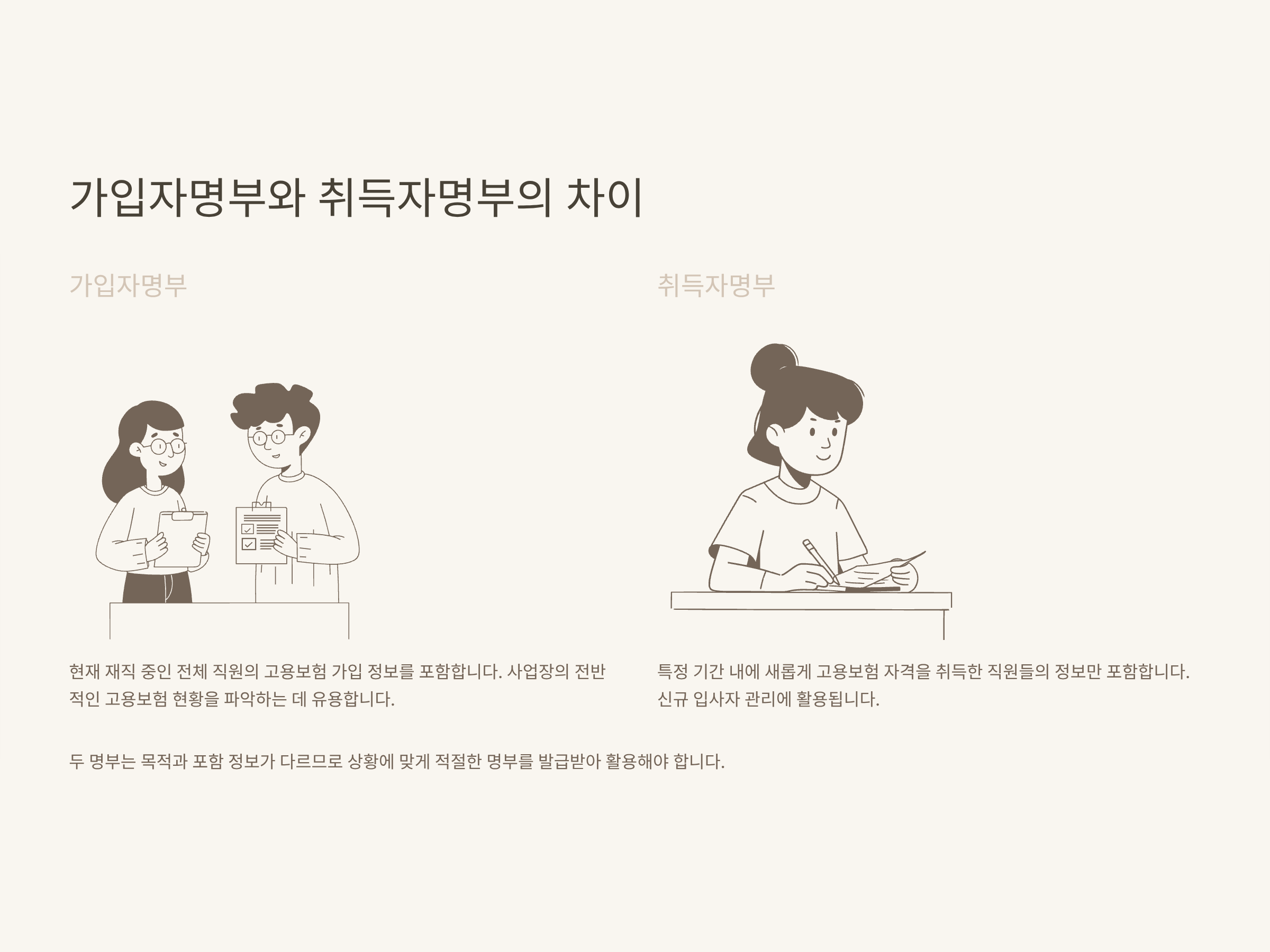 고용보험 관련 문서에는 사업장 가입자명부와 사업장 취득자 명부가 있습니다. 처음에는 이름이 비슷해서 헷갈렸는데, 발급받아보니 명확히 구분됩니다. 가입자명부는 현재 재직 중인 전 직원의 고용보험 현황을 보여주는 반면, 취득자 명부는 특정 기간 내에 신규로 고용보험 자격을 취득한 직원 명단만 표시합니다. 예를 들어, 올해 1월에 입사한 직원만 보고 싶다면 취득자 명부를 발급하면 됩니다.