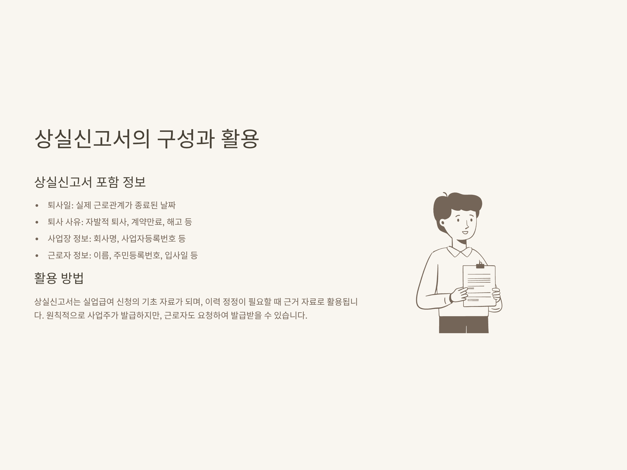 상실신고서 발급은 사업주가 주로 하지만, 필요 시 근로자가 요청해 발급받을 수 있습니다. 이 서류에는 퇴사 사유, 상실일, 사업장 정보가 기재되며, 실업급여 신청이나 이력 정정 시 근거 자료로 활용됩니다.