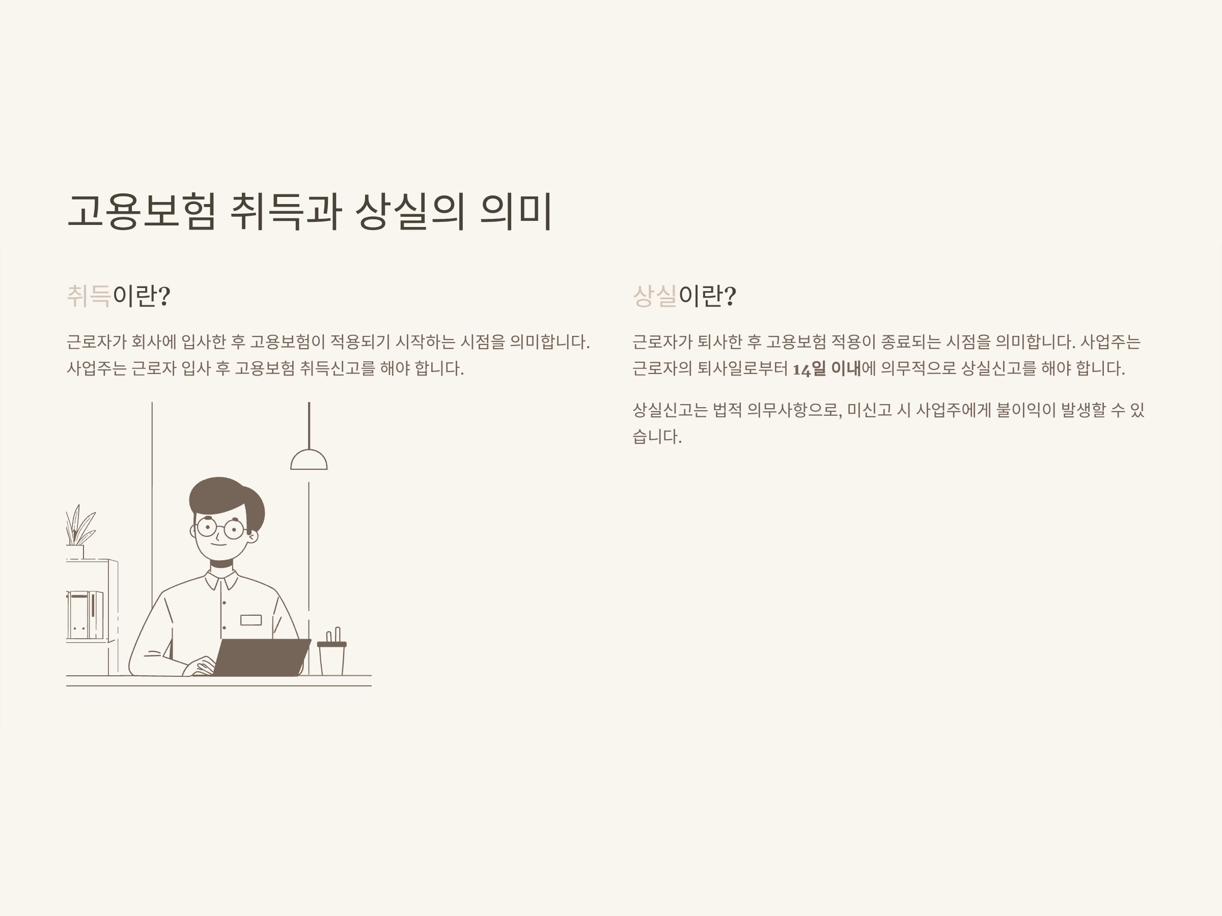 고용보험에서 ‘취득’은 근로자가 사업장에 입사해 보험 적용 대상이 되는 것을 의미하고, ‘상실’은 퇴사 등으로 보험 적용에서 제외되는 것을 말합니다. 상실신고는 사업주가 퇴사일로부터 14일 이내에 신고해야 하며, 신고 지연 시 과태료가 부과될 수 있습니다.