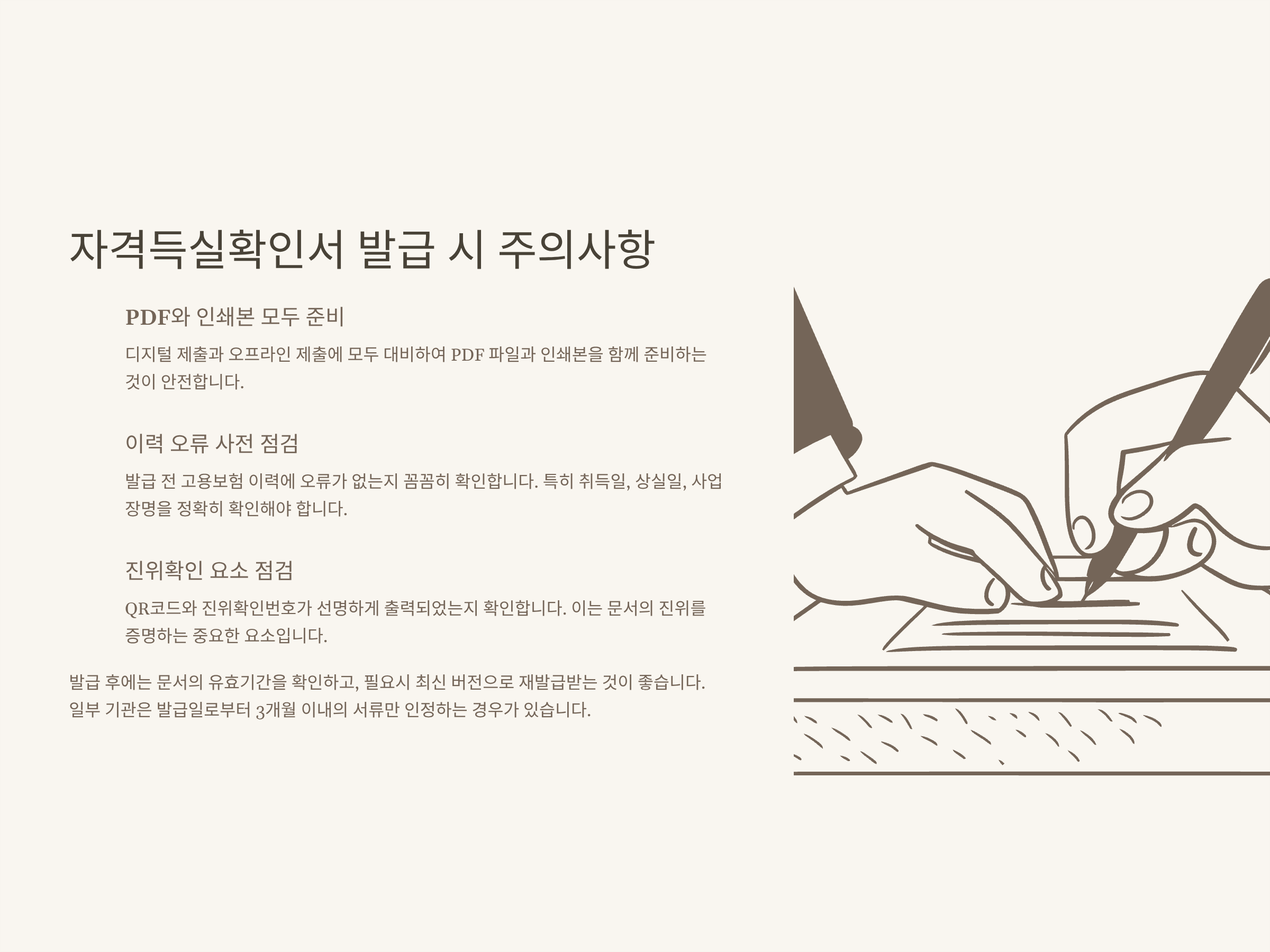 조회 후에는 바로 자격득실확인서를 발급해 묶음 제출하는 것이 가장 실무적이었습니다. 전자문서 진위확인이 가능한 기관이라면 문서 하단의 진위확인 번호로 검증할 수 있어, 출력 없이도 처리가 깔끔했습니다.