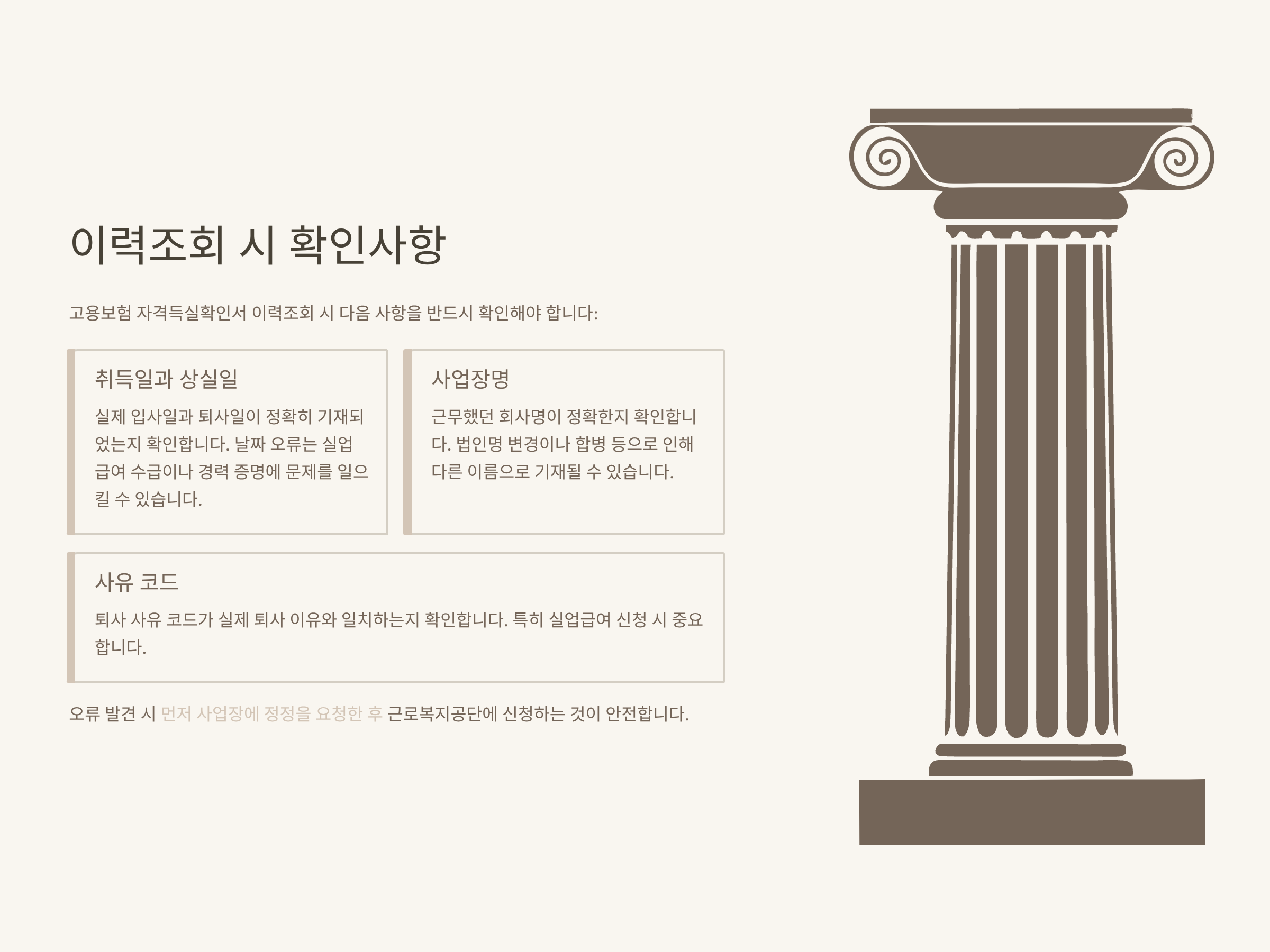 | 취득일·상실일 | 재직기간·수급자격 판단의 기준 | 사업장에 정정 요청 → 공단 상담 |