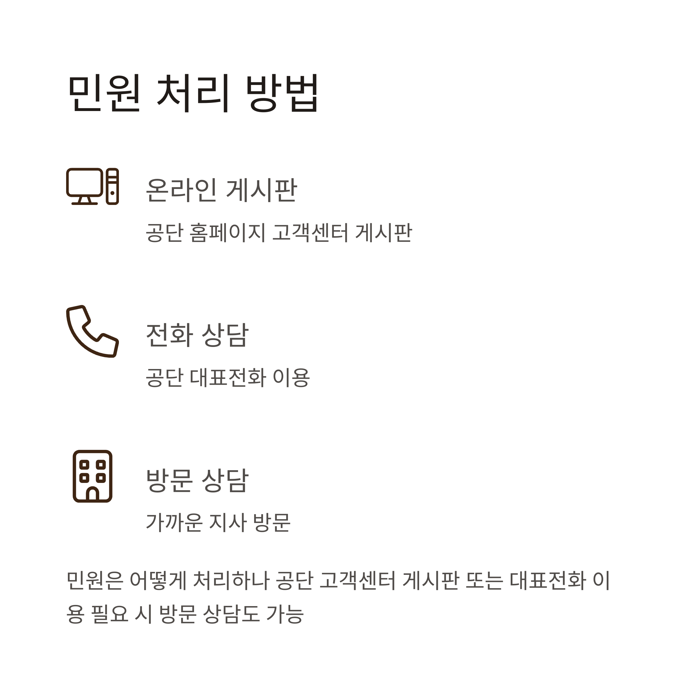 | 민원 처리 | 공단 고객센터 게시판 또는 전화 접수 |