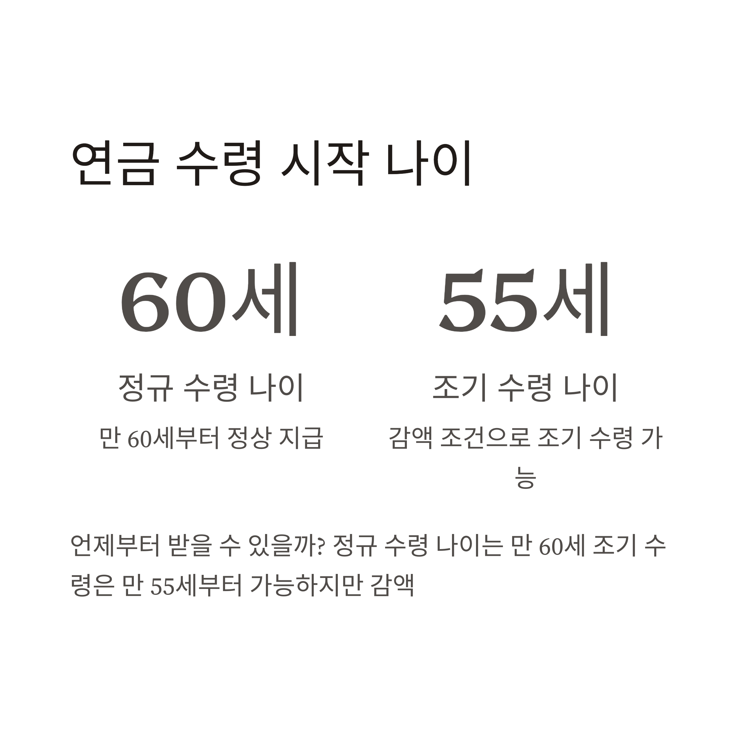 | 수령 나이 | 정규 수령: 만 60세 / 조기 수령: 만 55세 (감액) |