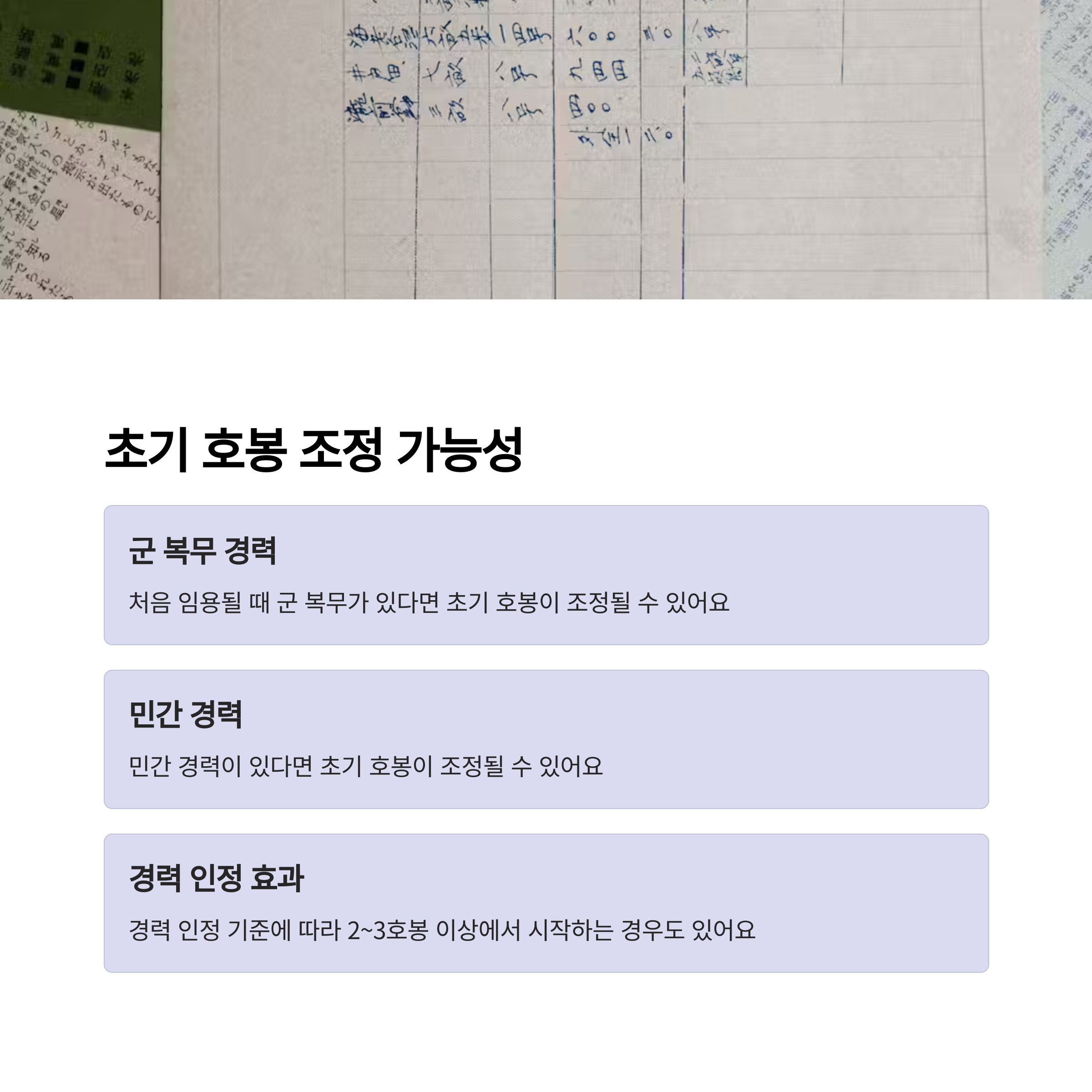 또한 군 복무나 민간경력 인정제도를 통해 초임 호봉 조정을 신청할 수 있습니다. 저도 군 경력으로 1호봉이 아닌 2호봉으로 시작했었는데, 이런 제도는 실제 급여와 경력 인정 모두에 긍정적 영향을 줍니다.