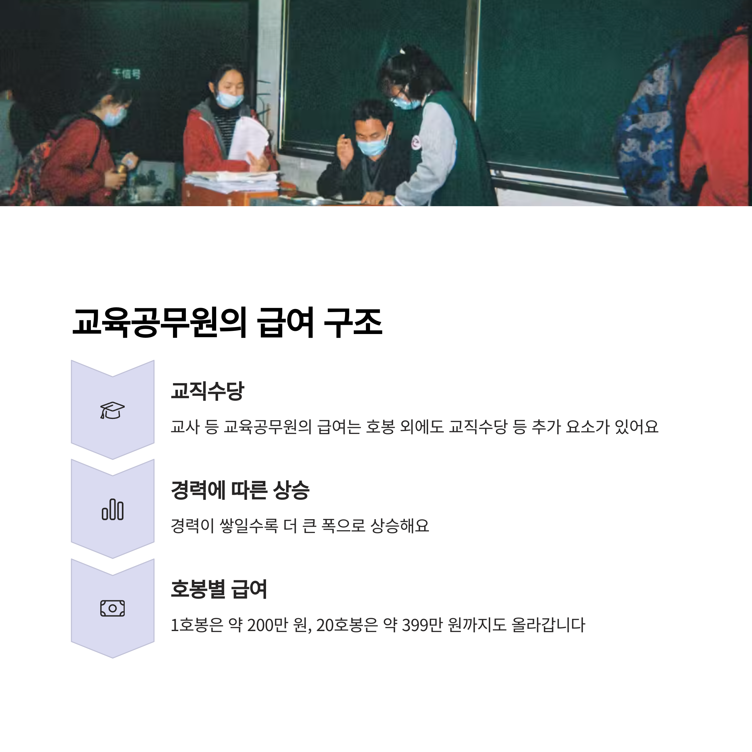 예를 들어 중등교사 기준 1호봉과 20호봉의 기본급 차이는 약 200만 원에 달할 정도로 경력 쌓을수록 인상폭이 큽니다. 또한 석사, 박사 등의 학위나 경력도 일부 호봉으로 인정되며, 군 경력도 포함되어 들어가는 경우가 많습니다.