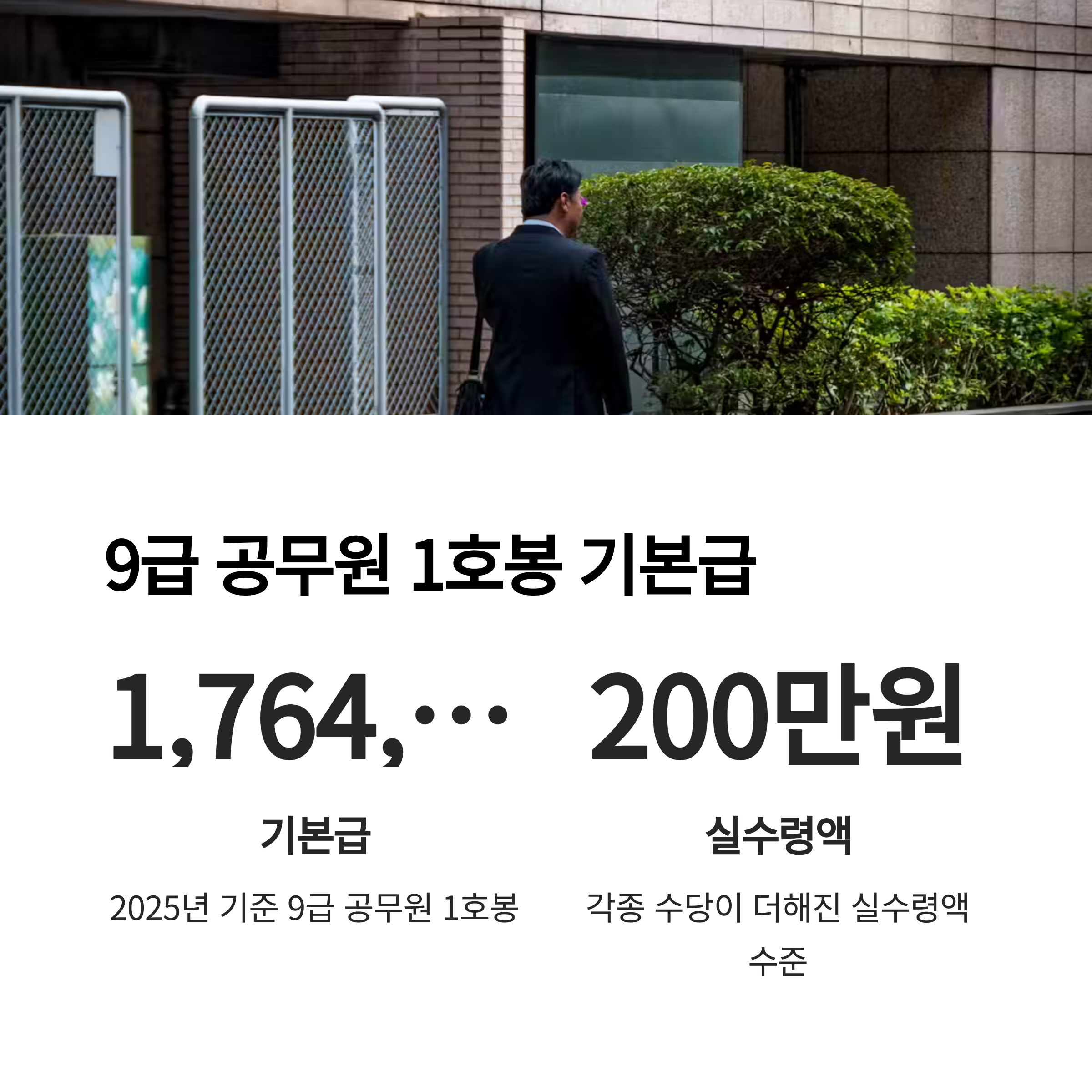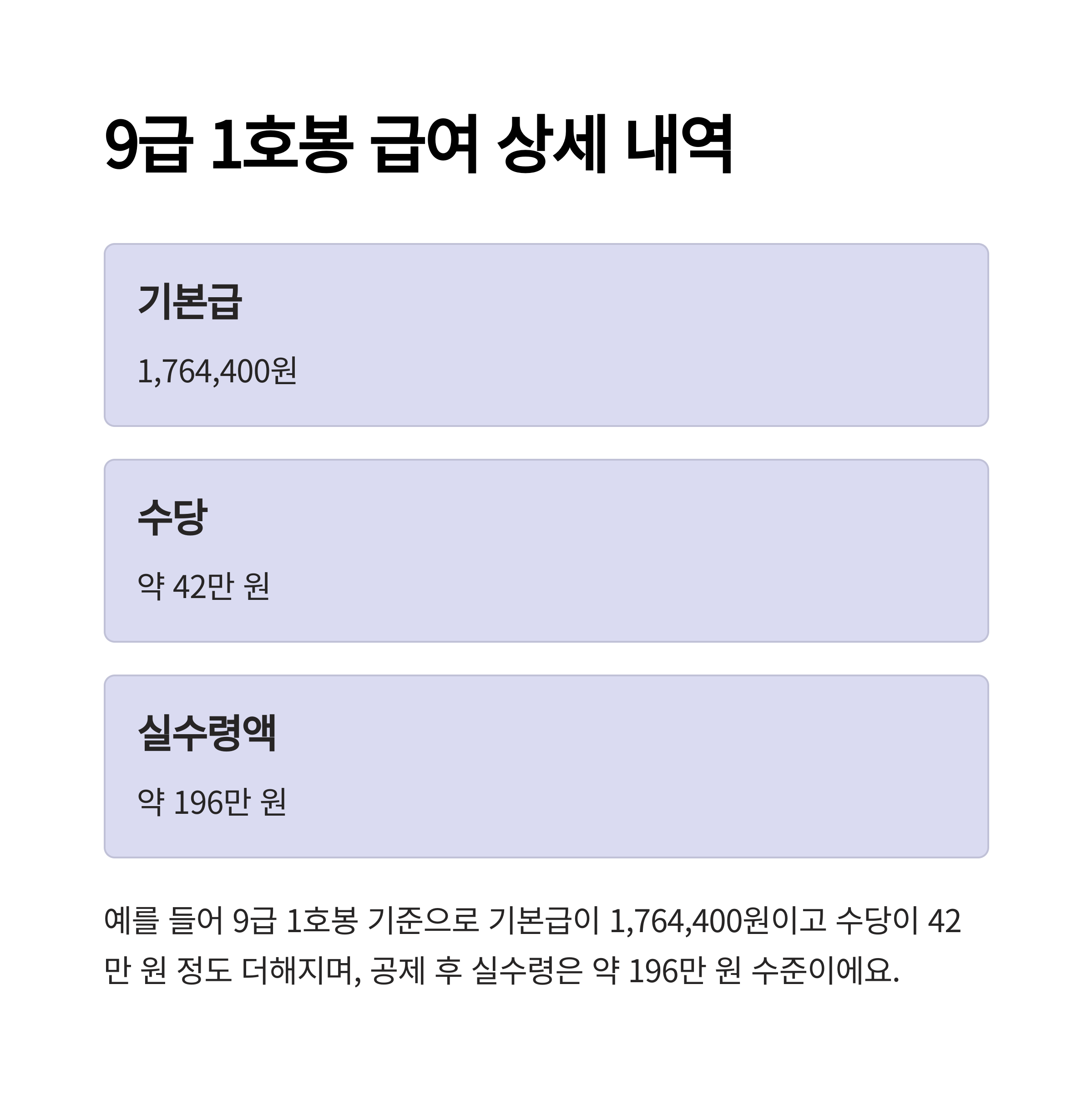 9급 1호봉 기준 기본급은 2025년 기준 1,764,400원입니다. 여기에 정근수당, 직급보조비, 가족수당, 지역가산금 등이 추가되며 평균 실수령액은 약 200만 원 초반대입니다. 물론 지역에 따라 조금씩 차이는 있겠지만, 대체로 큰 편차는 없습니다.