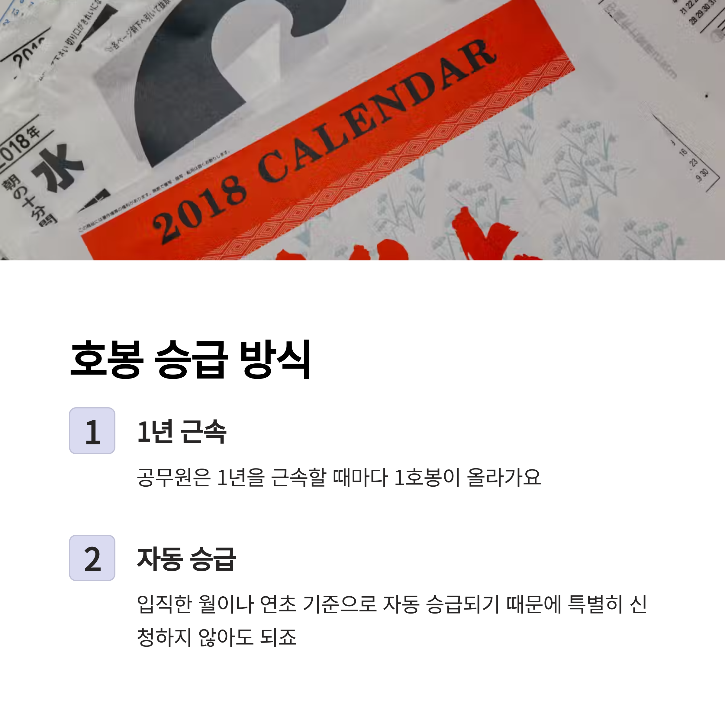 제가 공직생활 중 느낀 점 중 하나는 호봉 승급이 생각보다 자동적이고 명확하다는 것이었습니다. 대부분의 경우 근속연수 1년에 1호봉씩 올라가며, 이 승급은 매년 정기 인사 발령에 맞춰 반영됩니다.