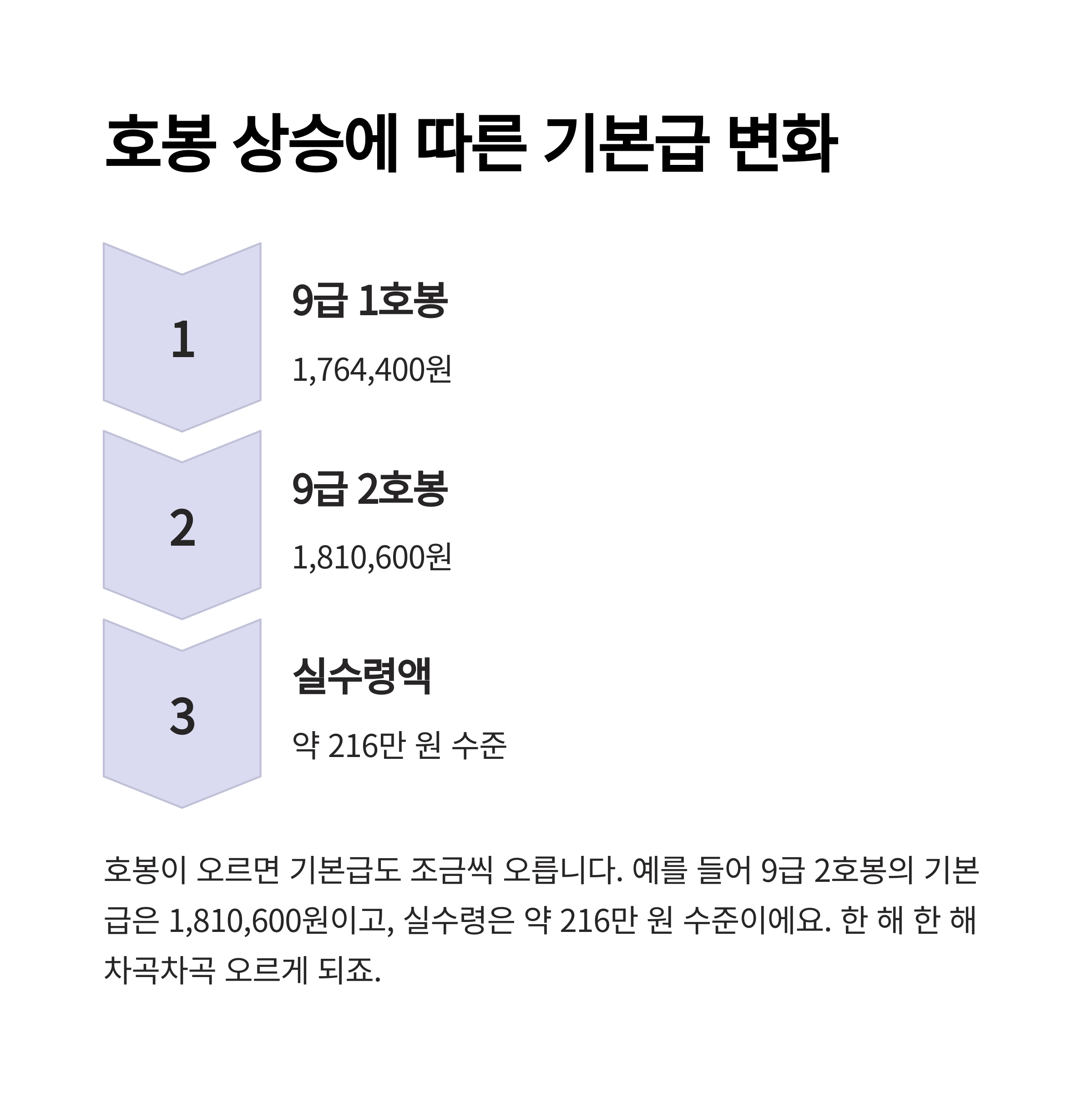 우선 호봉은 직급이 올라가도 계속 누적됩니다. 예를 들어 9급으로 3년 근무 후 7급으로 승진했다면, 호봉은 그대로 유지되어 7급 4호봉으로 이어지게 됩니다. 그리고 직급이 오르면서 기본급 단가 자체가 상승하기 때문에 실수령액도 꽤 달라지게 됩니다.