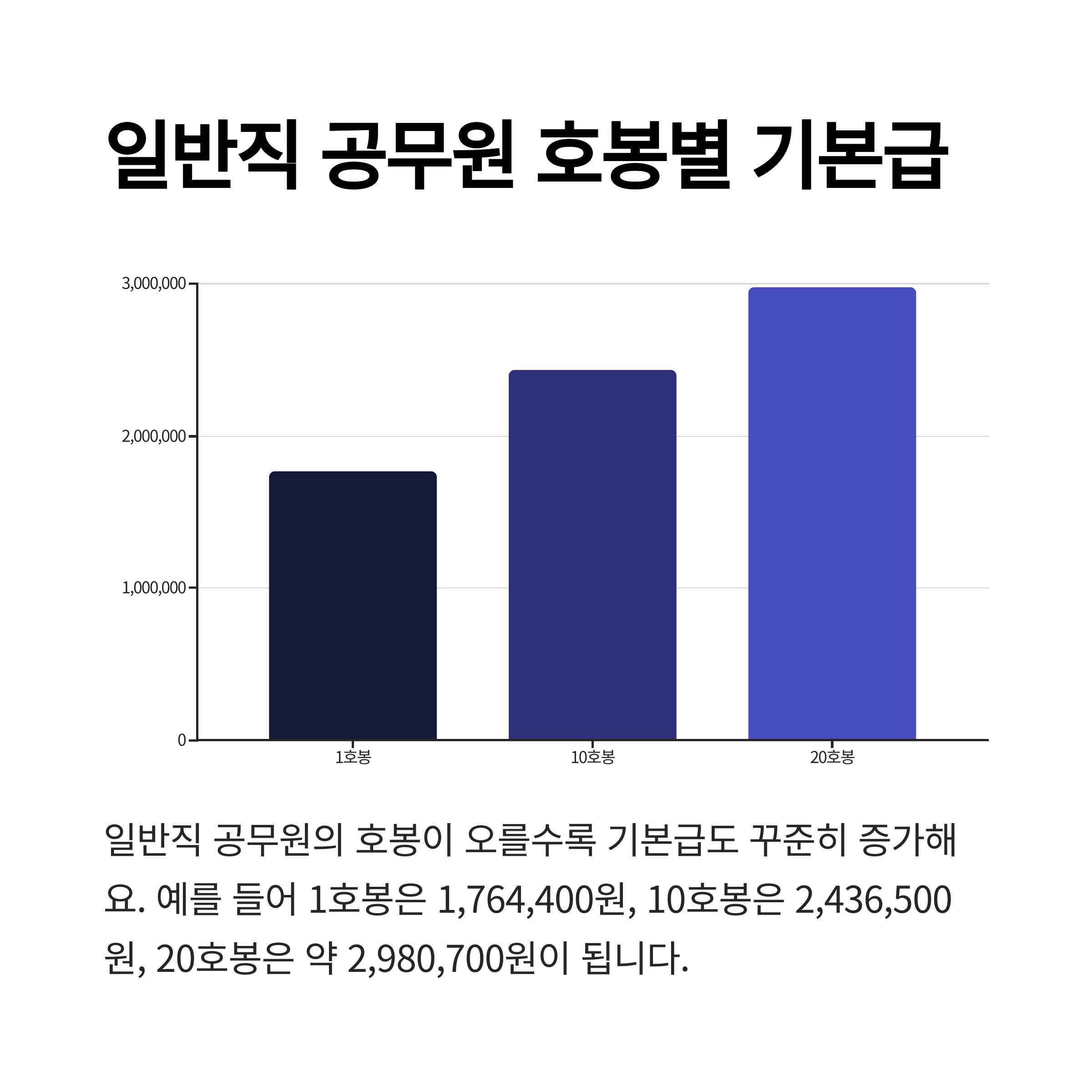 일반직은 크게 9급~1급까지 등급이 나뉘며, 각 직급별로 1호봉부터 시작해 근속 연수에 따라 호봉이 상승합니다. 가장 많이 입직하는 9급 기준으로, 앞서 말씀드린 대로 1호봉은 1,764,400원이며, 20호봉까지 오르면 약 3,000,000원 가까운 기본급을 받게 됩니다.