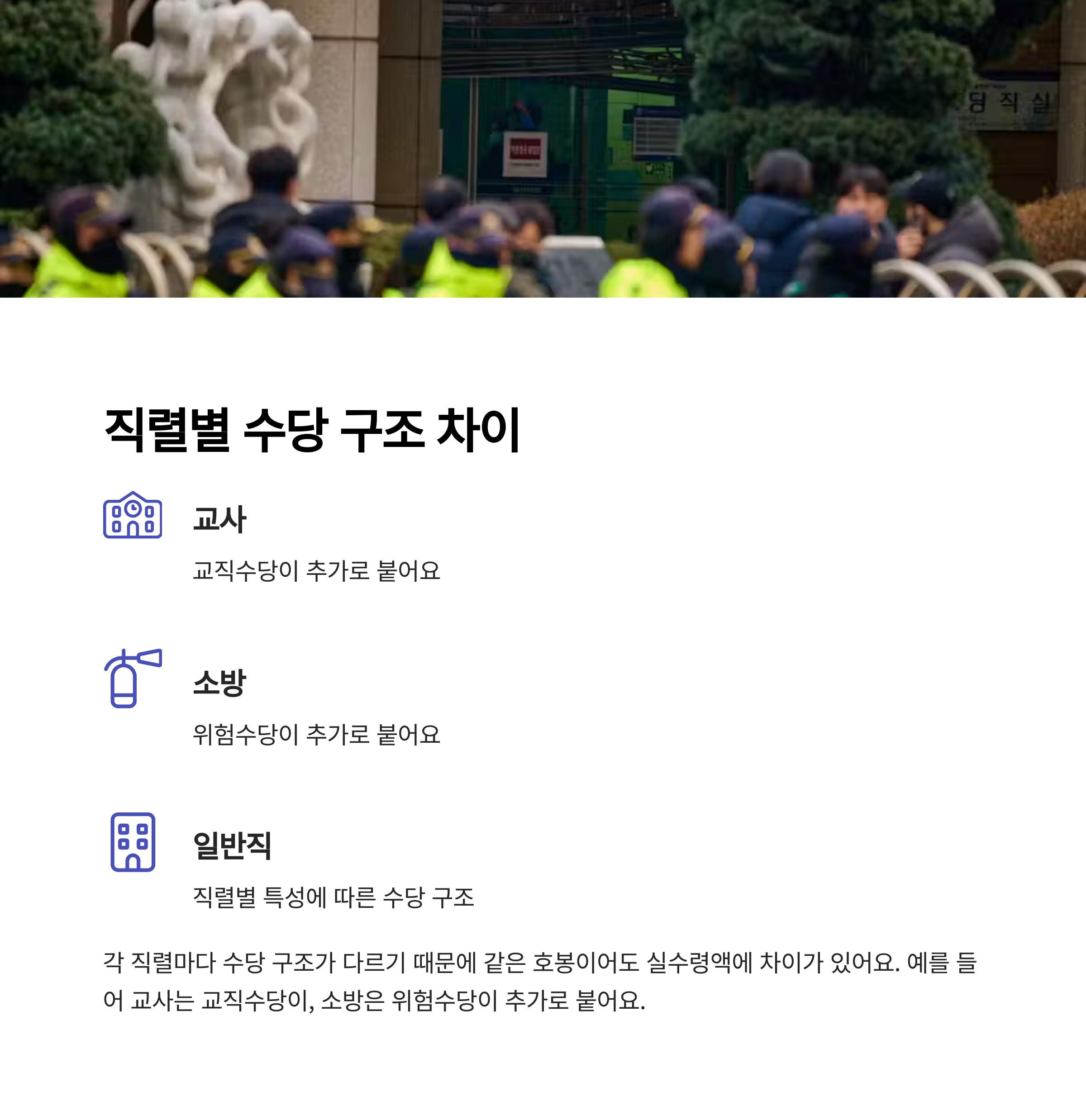 제가 여러 직종을 비교해보면서 느낀 점은, 교육공무원과 소방공무원의 호봉 체계가 기본적으로는 비슷하지만, 수당 구조에서 차이가 있다는 것입니다. 소방공무원은 위험직무수당, 교육공무원은 교직수당이나 보전수당이 포함되어 최종 호봉표 세전 금액에 차이가 발생합니다.