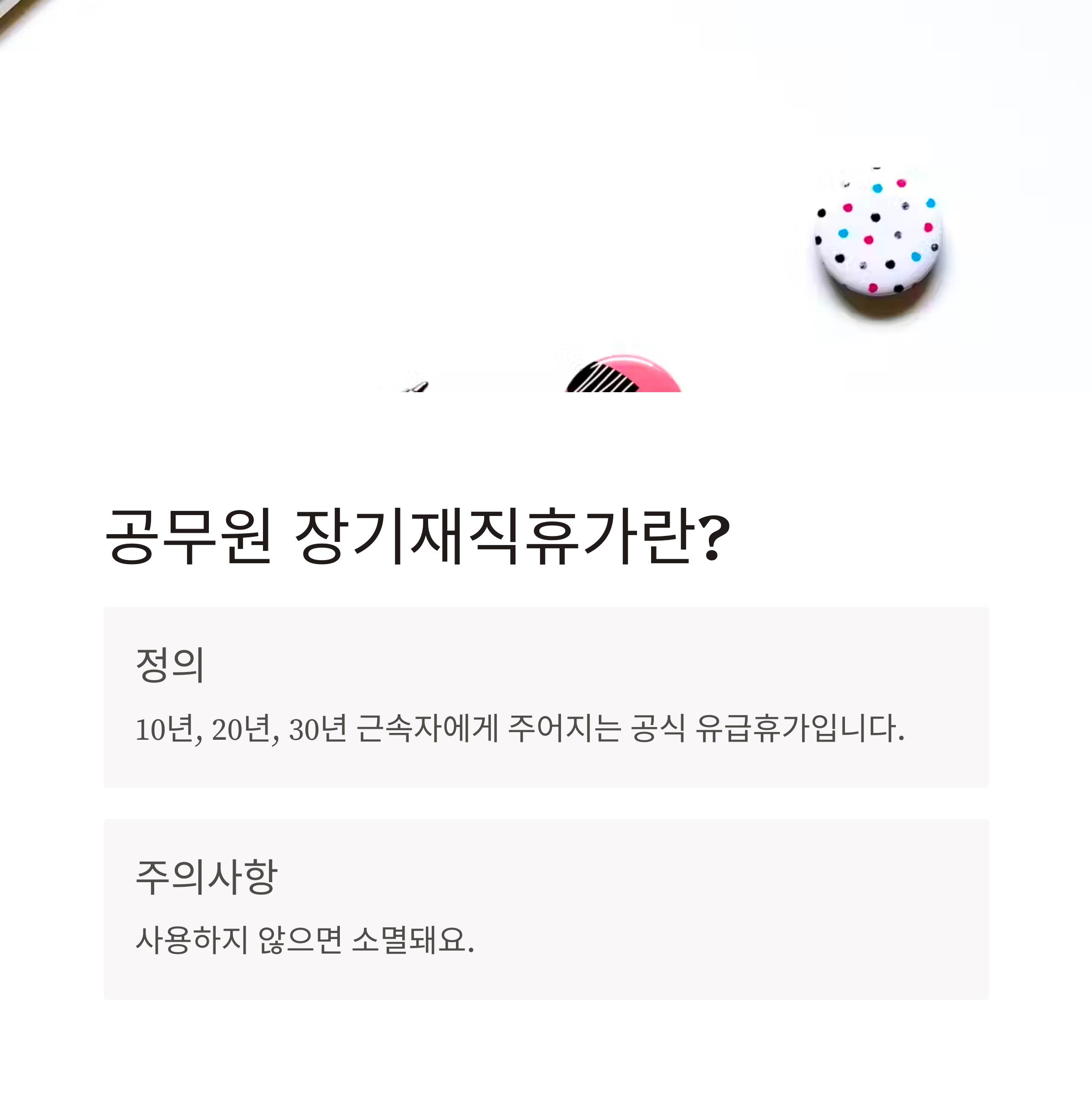 장기재직휴가를 계획하신다면 몇 년 근속 시, 며칠을 쉴 수 있는지가 가장 궁금하실 텐데요. 저도 처음엔 헷갈렸는데 인사혁신처 자료를 통해 정확하게 파악할 수 있었습니다.