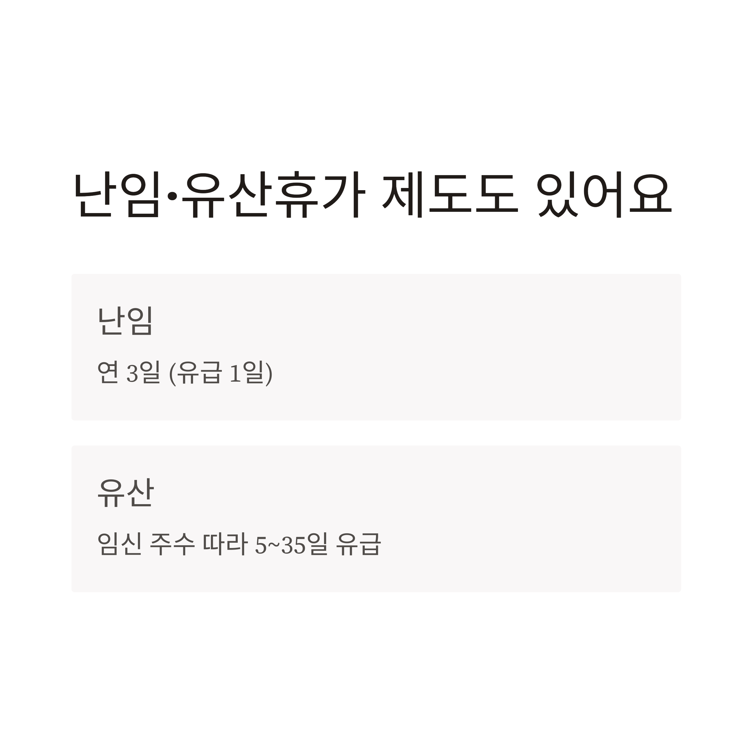 - 난임치료휴가: 연간 3일(유급 1일 + 무급 2일)