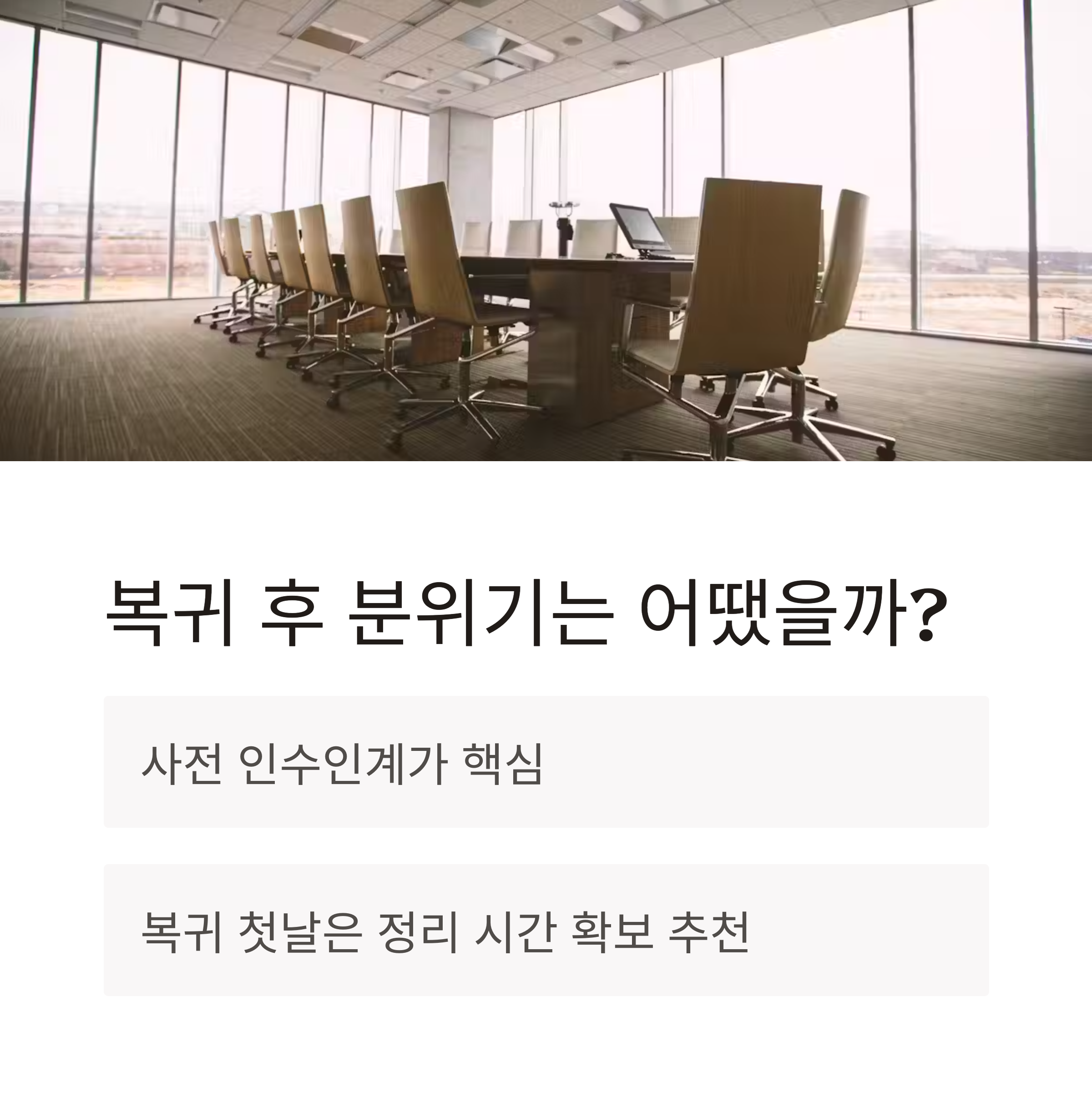 저는 복귀 첫날 오전에는 시간을 조금 여유롭게 잡고, 인수인계 문서와 공지사항을 정독했습니다. 업무 적응을 위한 시간 확보도 중요하고, 복귀 후 소통을 통해 ‘공백에 대한 미안함’도 덜 수 있었던 것 같아요.
