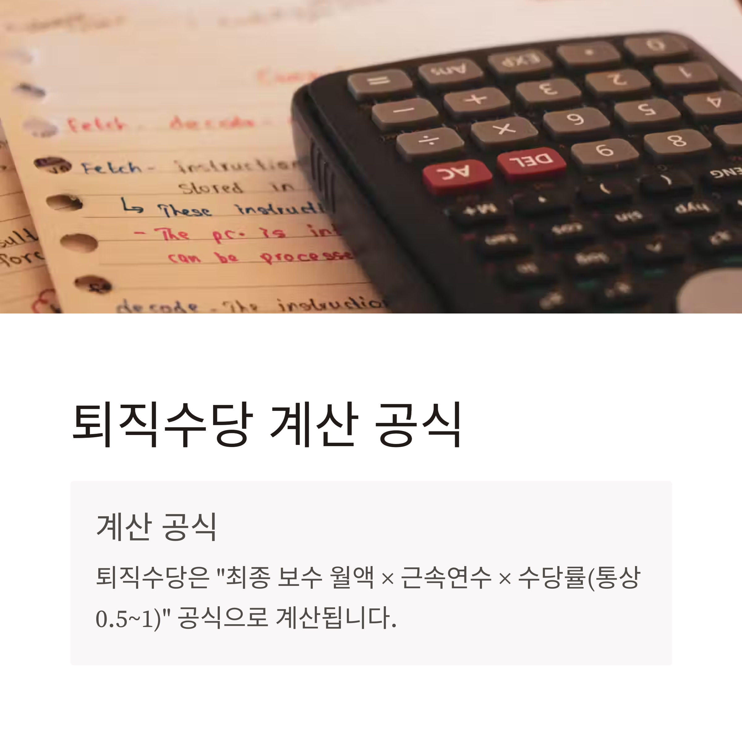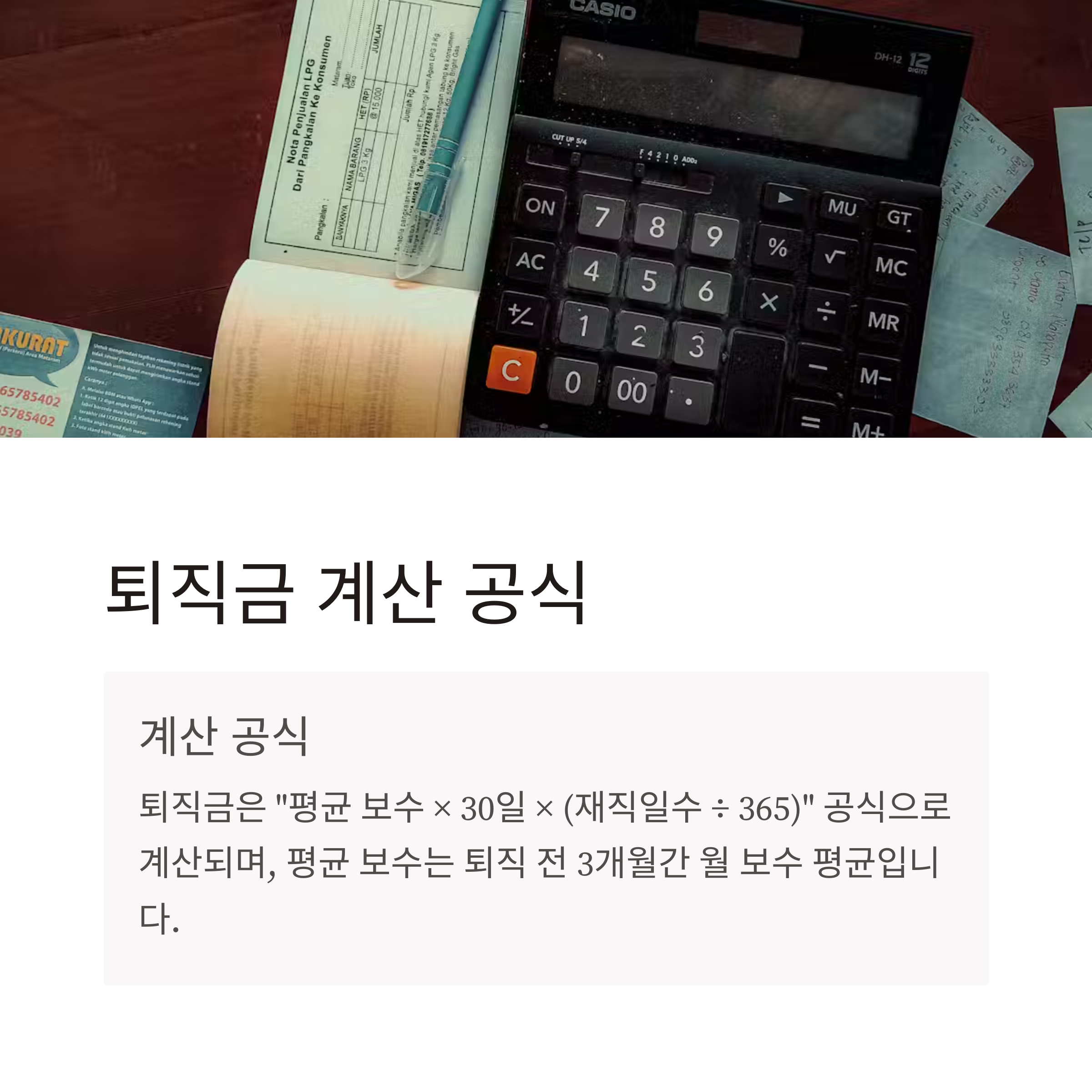 | 퇴직금 계산 | 평균 보수 × 30일 × (재직일수 ÷ 365) |