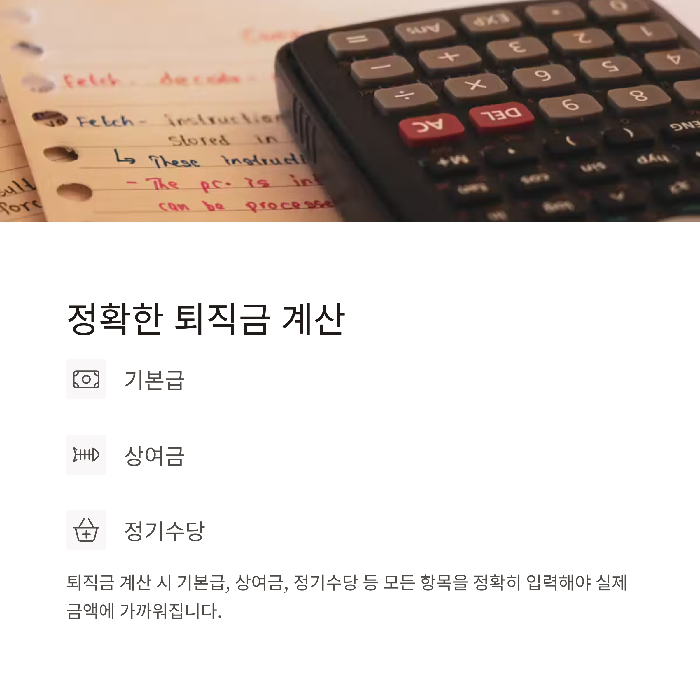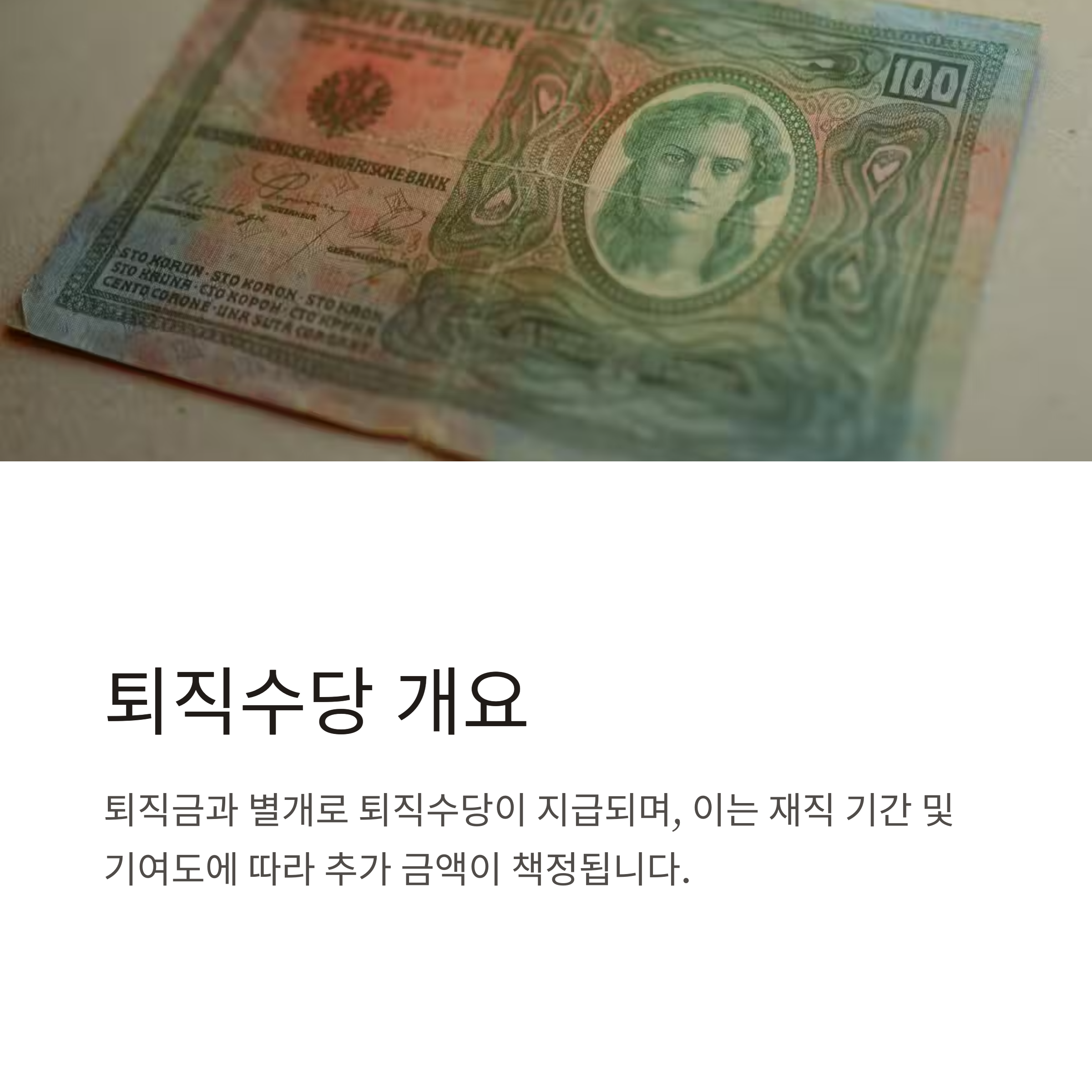 | 퇴직수당 | 성과 보상 개념, 별도 계산 및 지급 |