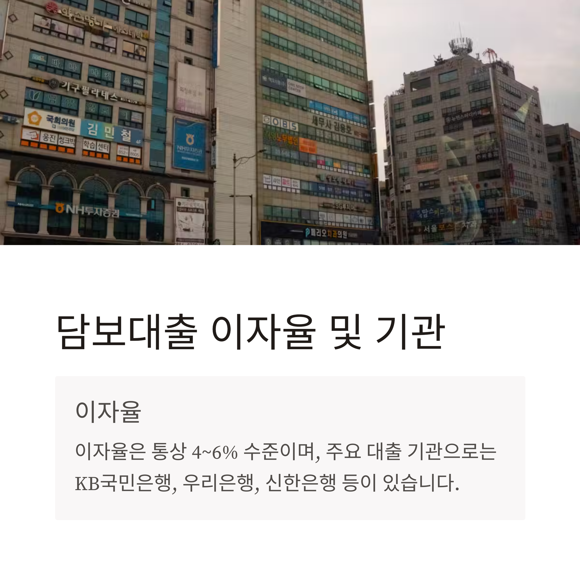 | 대출 기관 | 국민은행, 우리은행, 신한은행 등 |