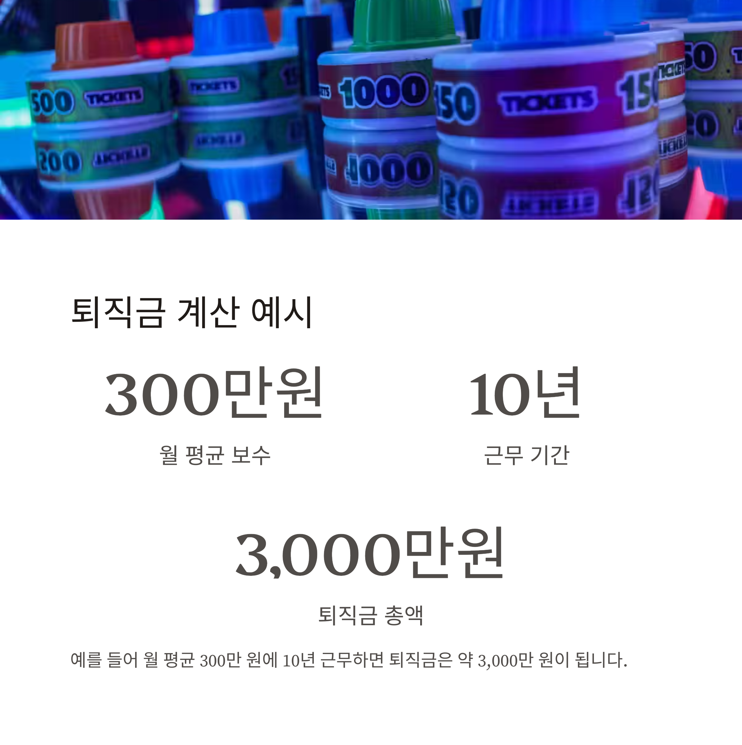 예를 들어, 월 평균 보수가 300만 원이고 10년 근무(3650일)했다면: