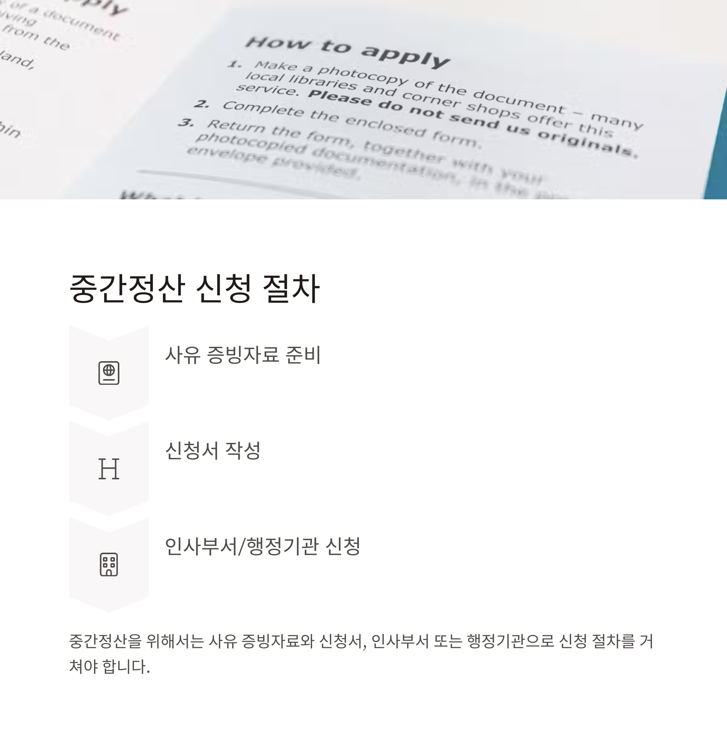 - 제출 서류: 사유 증빙자료 + 퇴직금 중간정산 신청서