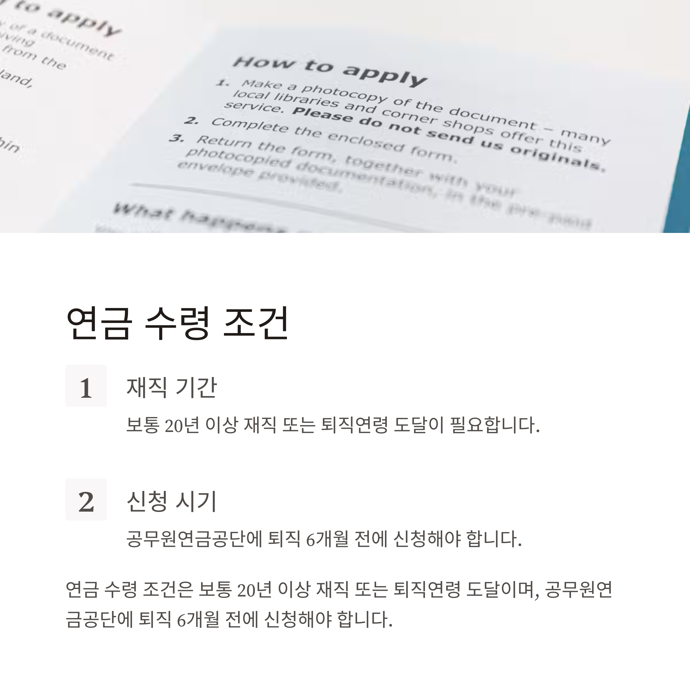 - 연금 수령 요건: 20년 이상 재직, 퇴직연령 도달 등