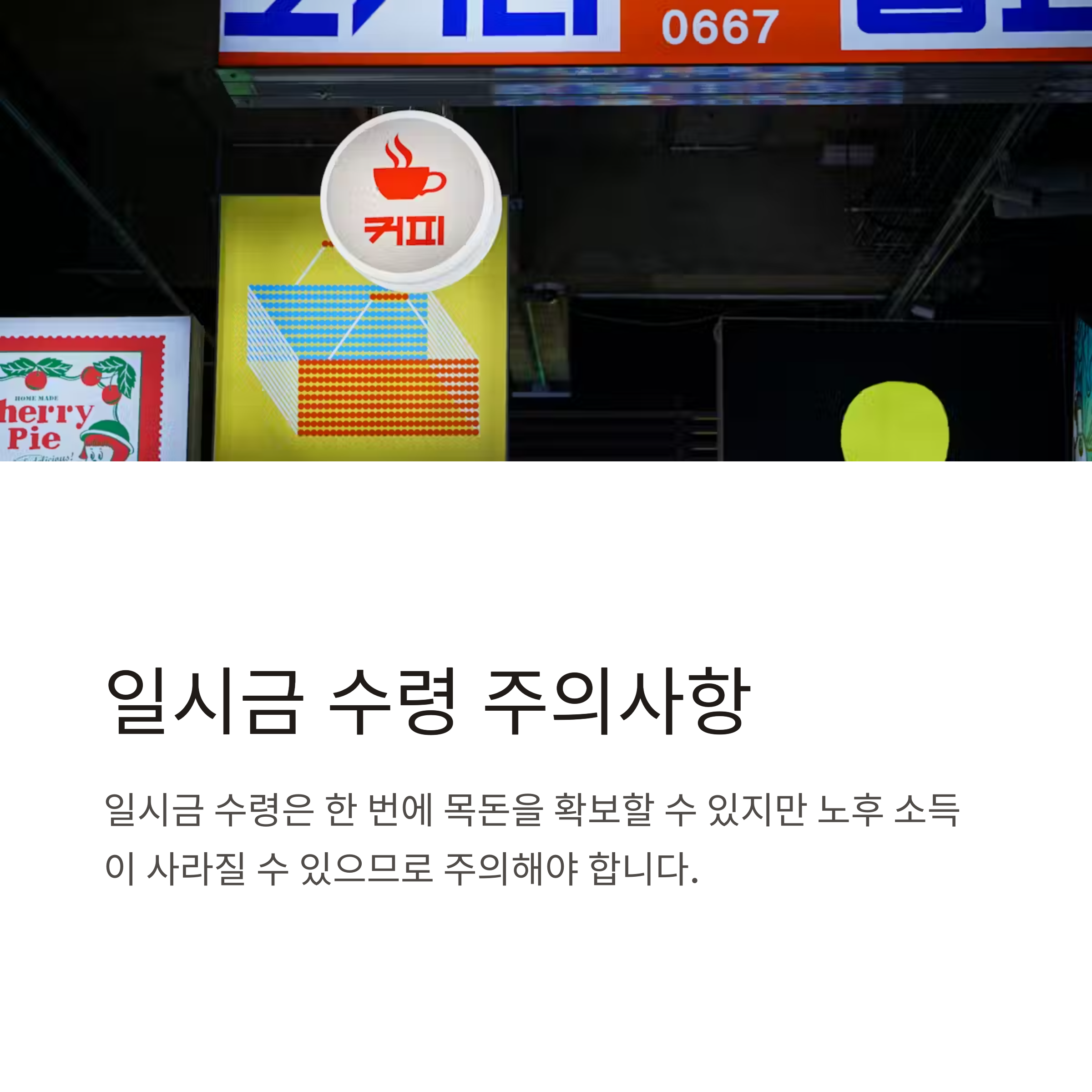 | 일시금 수령 | 한 번에 목돈 확보 가능 | 노후소득 미확보 위험 |
