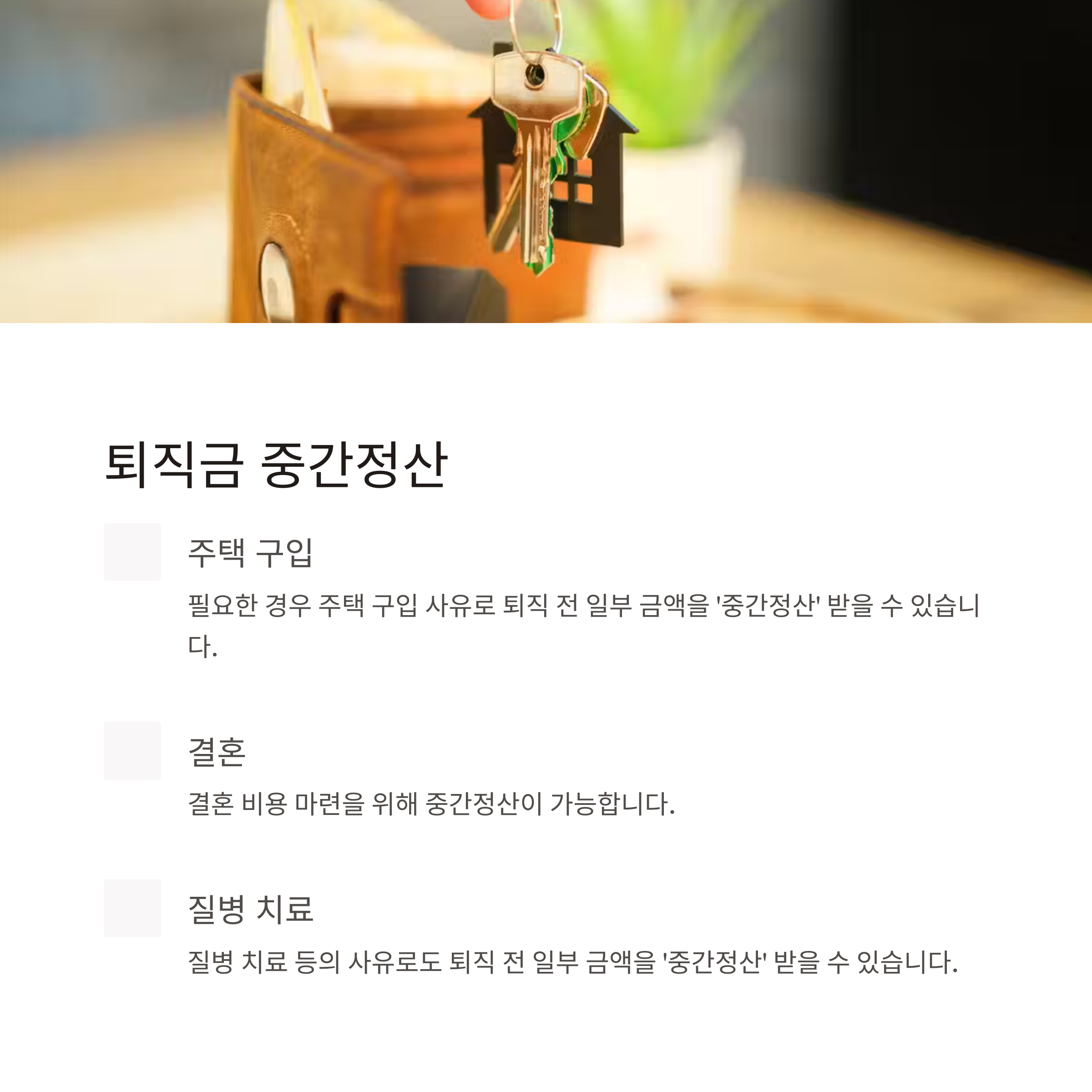 | 중간정산 | 주택 구입, 치료비 등 사유 시 가능 |