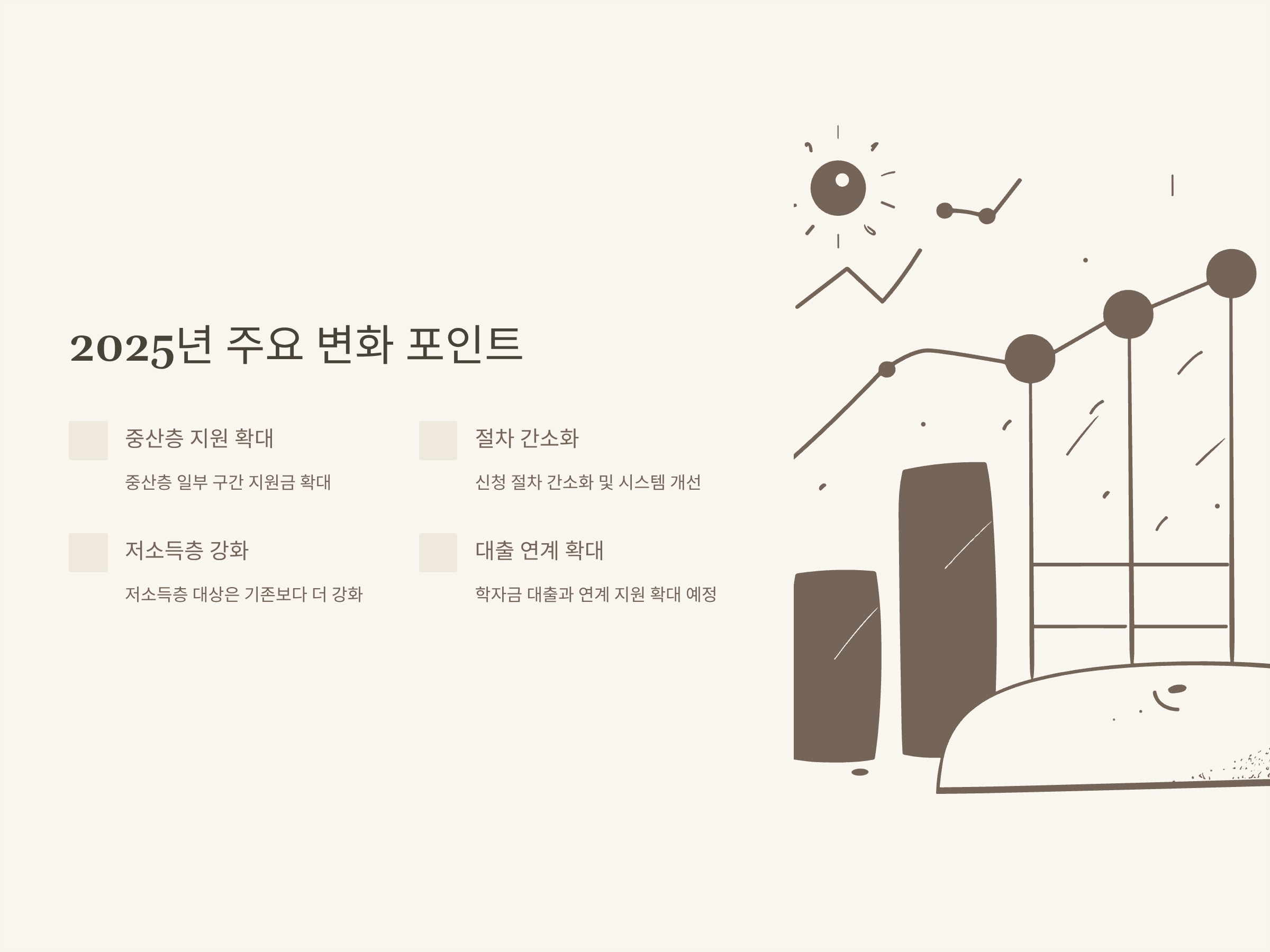 특히 2025년에는 저소득층 지원 강화와 중산층 확대 정책에 따라 자격 요건이 일부 완화될 예정입니다. 다만, 학점 유지나 출석률 등 일정한 학업 성취 기준을 충족해야 한다는 점은 꼭 기억하셔야 합니다.