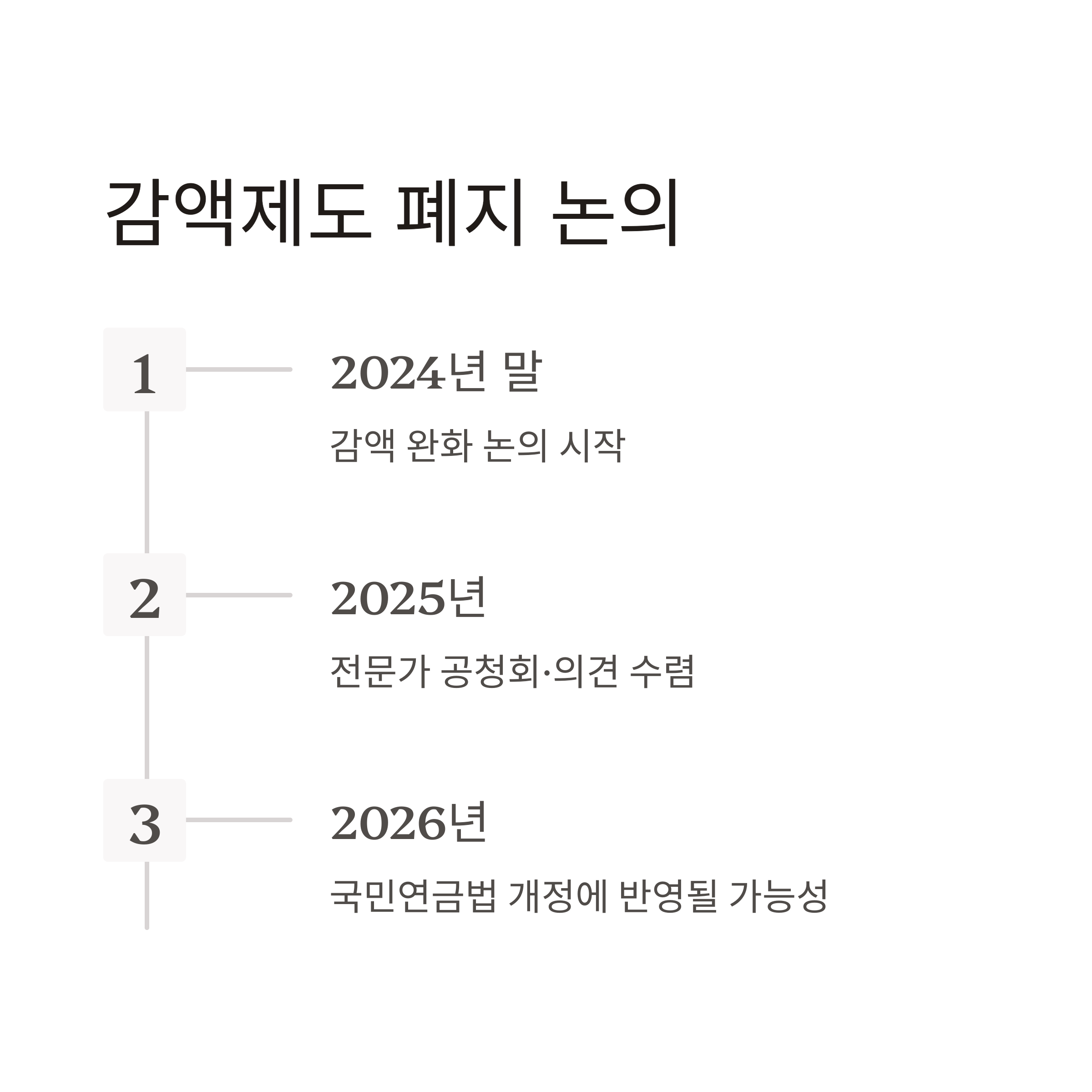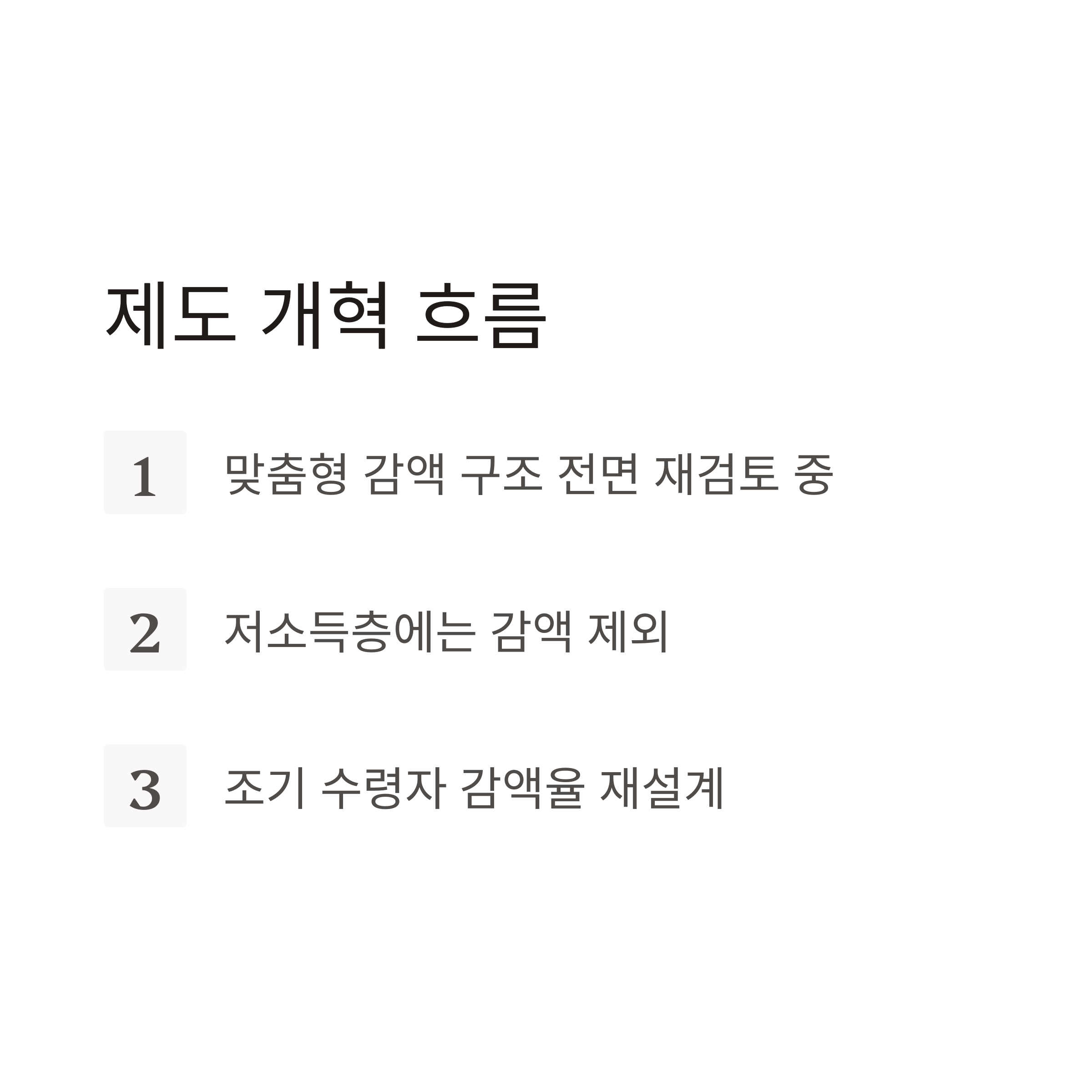 저는 국민연금 개혁 논의가 본격화되면서 감액제도도 크게 영향을 받을 거라고 예상했습니다. 실제로 최근 개혁안에는 저소득층 보호 및 형평성 강화 정책이 포함되어, 감액 완화 또는 폐지 방안이 다뤄지고 있어요.