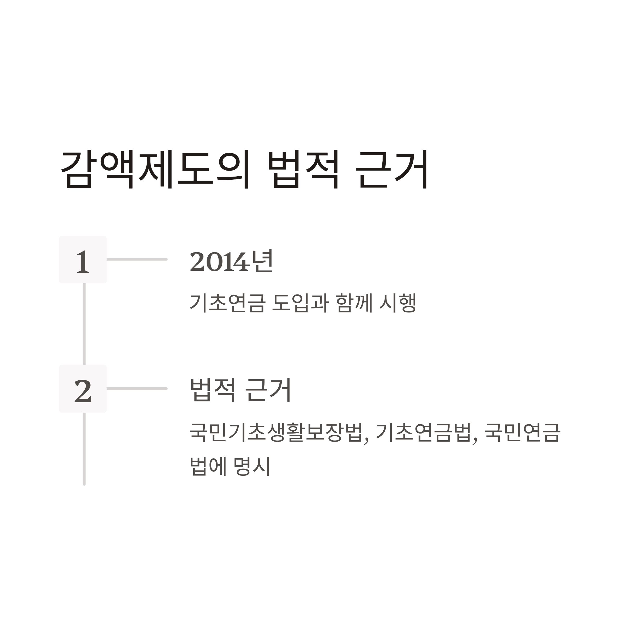 감액제도는 국민기초생활보장법, 기초연금법, 국민연금법 등에 명시되어 있으며, 실제로는 2014년 기초연금 제도 도입과 함께 본격화되었습니다.