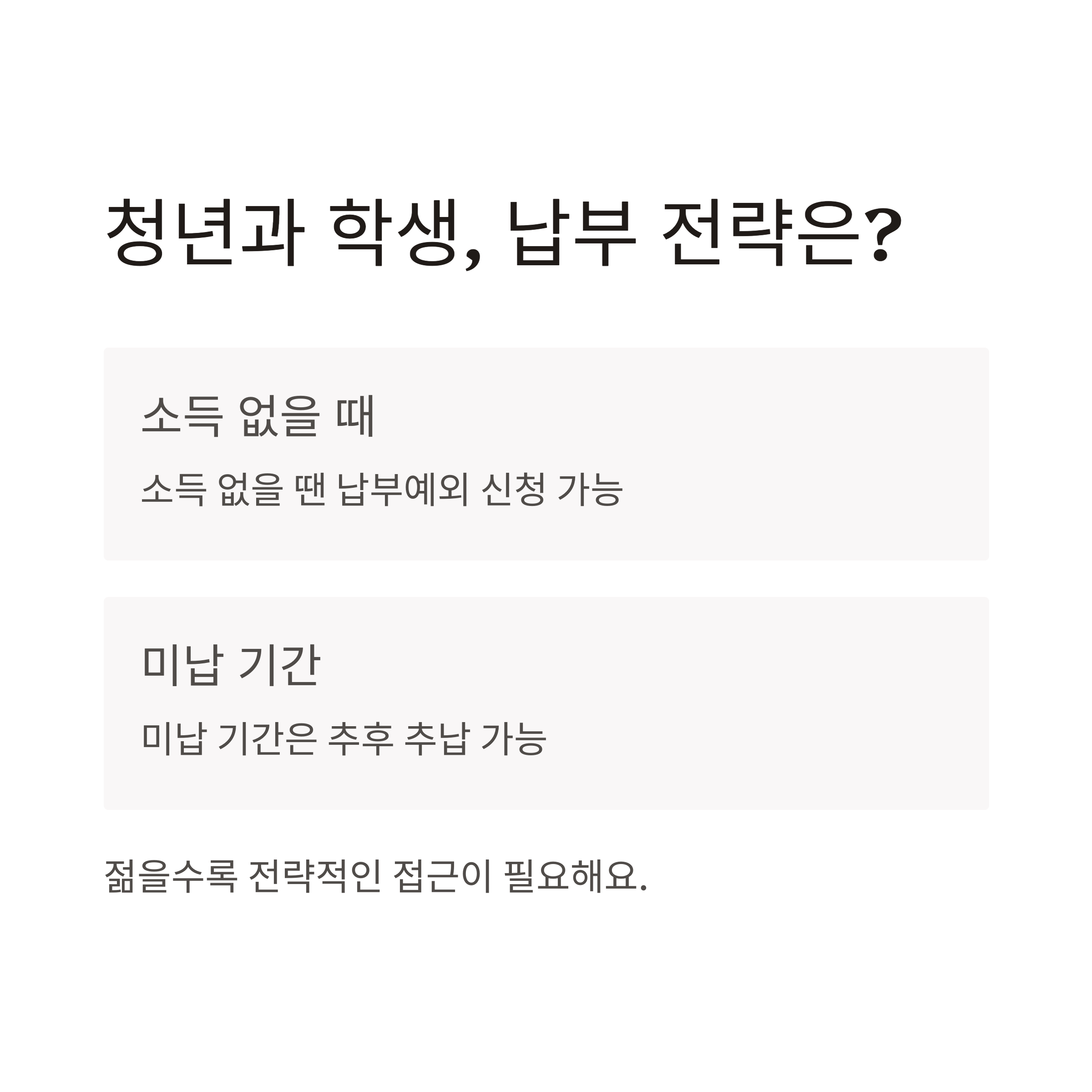납부 예외 신청을 통해 일정 조건에서는 납부를 유예할 수 있습니다. 학생이나 소득이 없는 청년이라면 다음 조건을 확인해보세요.