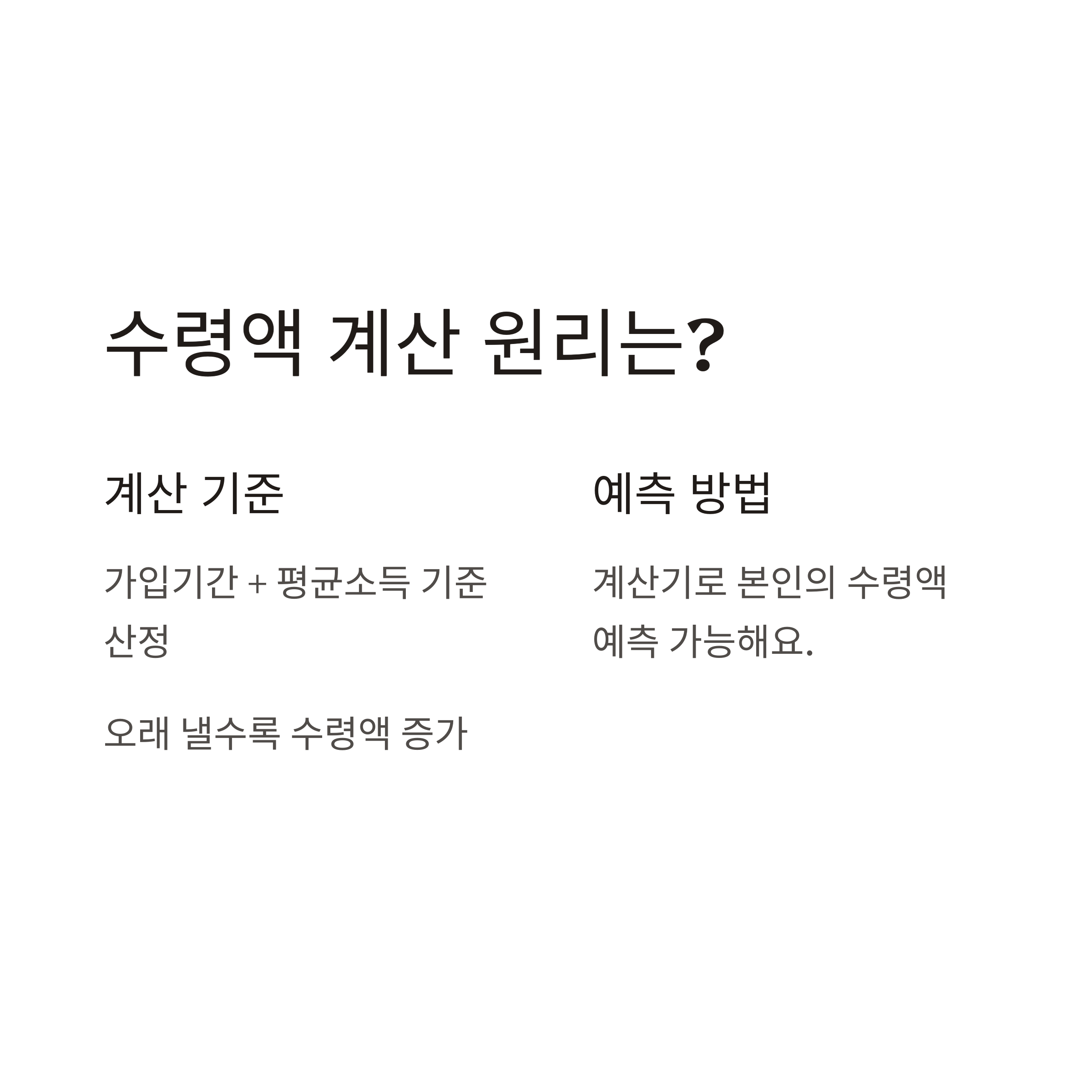 - 가입기간이 길고, 소득이 높을수록 수령액 증가