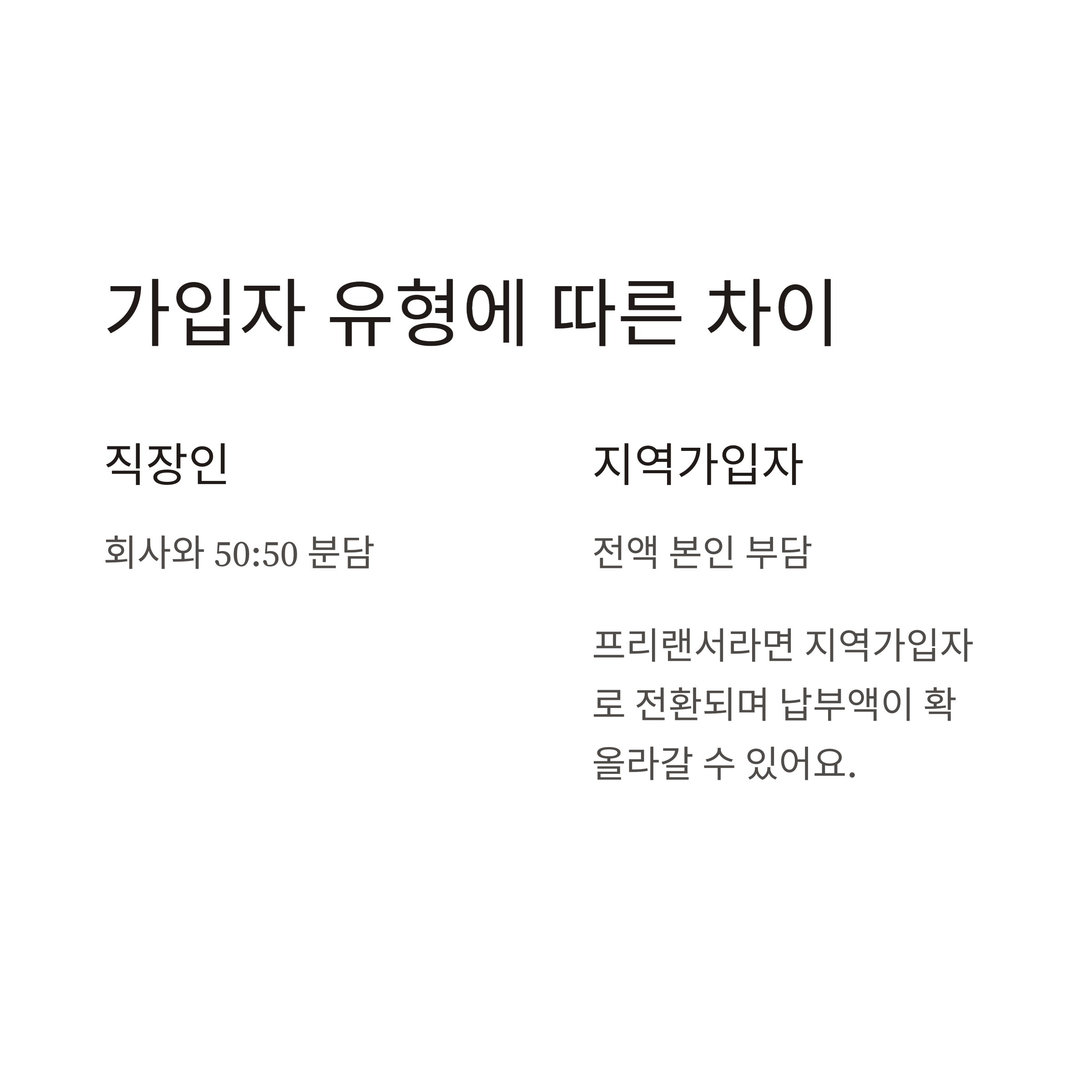 | 지역가입자 | 본인 100% | 직접 납부 고지서 수령 | 소득신고액 기준 산정 |