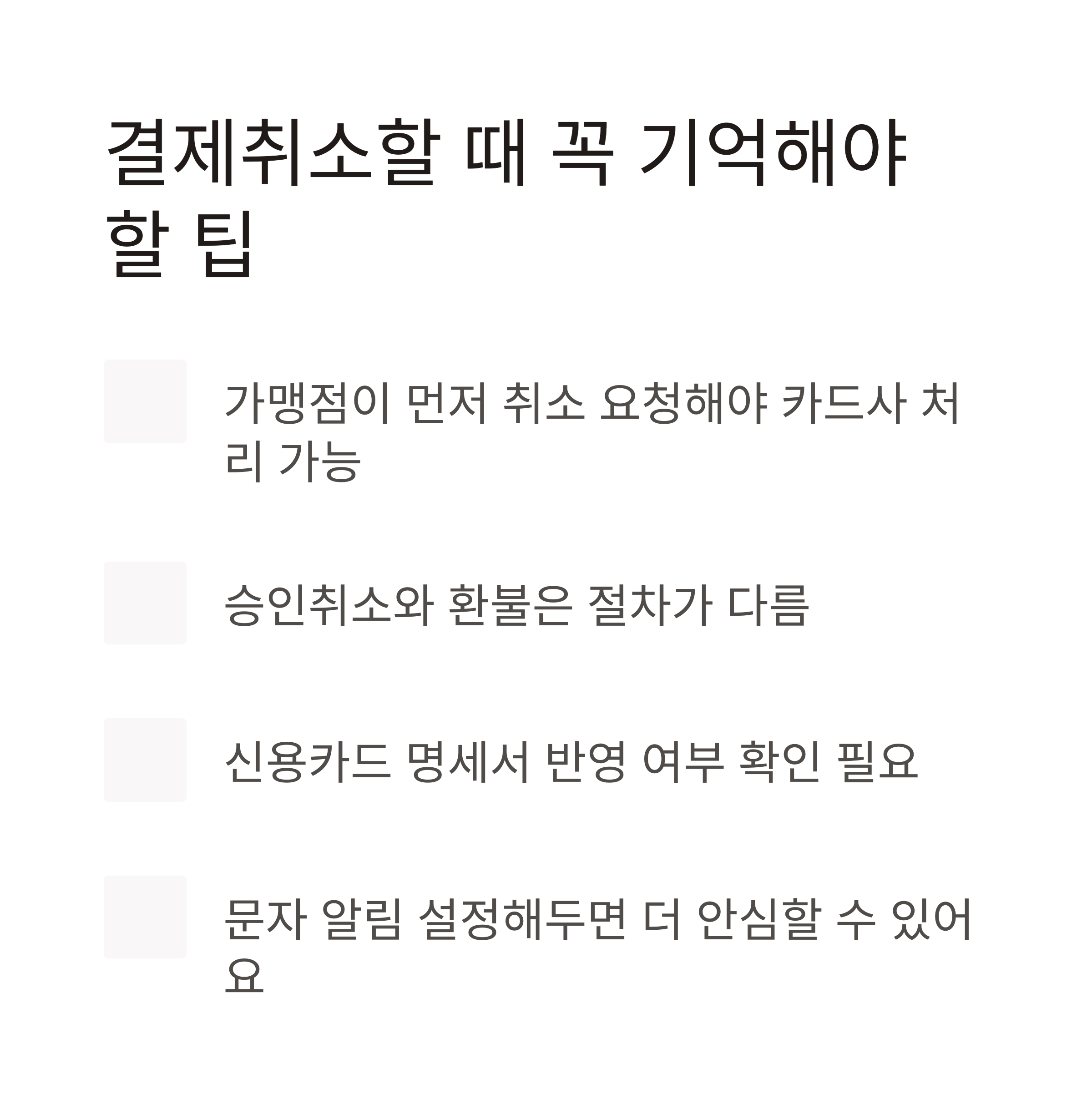 결제취소는 단순해 보이지만, 제가 겪어보니 놓치기 쉬운 포인트들이 꽤 많습니다. 몇 가지 팁을 정리해드릴게요.