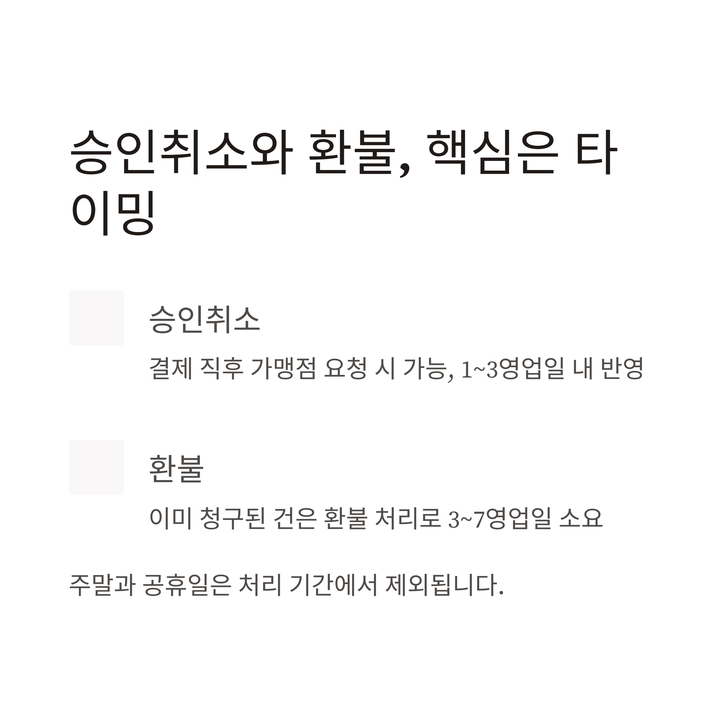 - 승인취소는 결제 직후 가맹점이 승인취소 요청하면 처리되며, 보통 당일~3영업일 내 반영