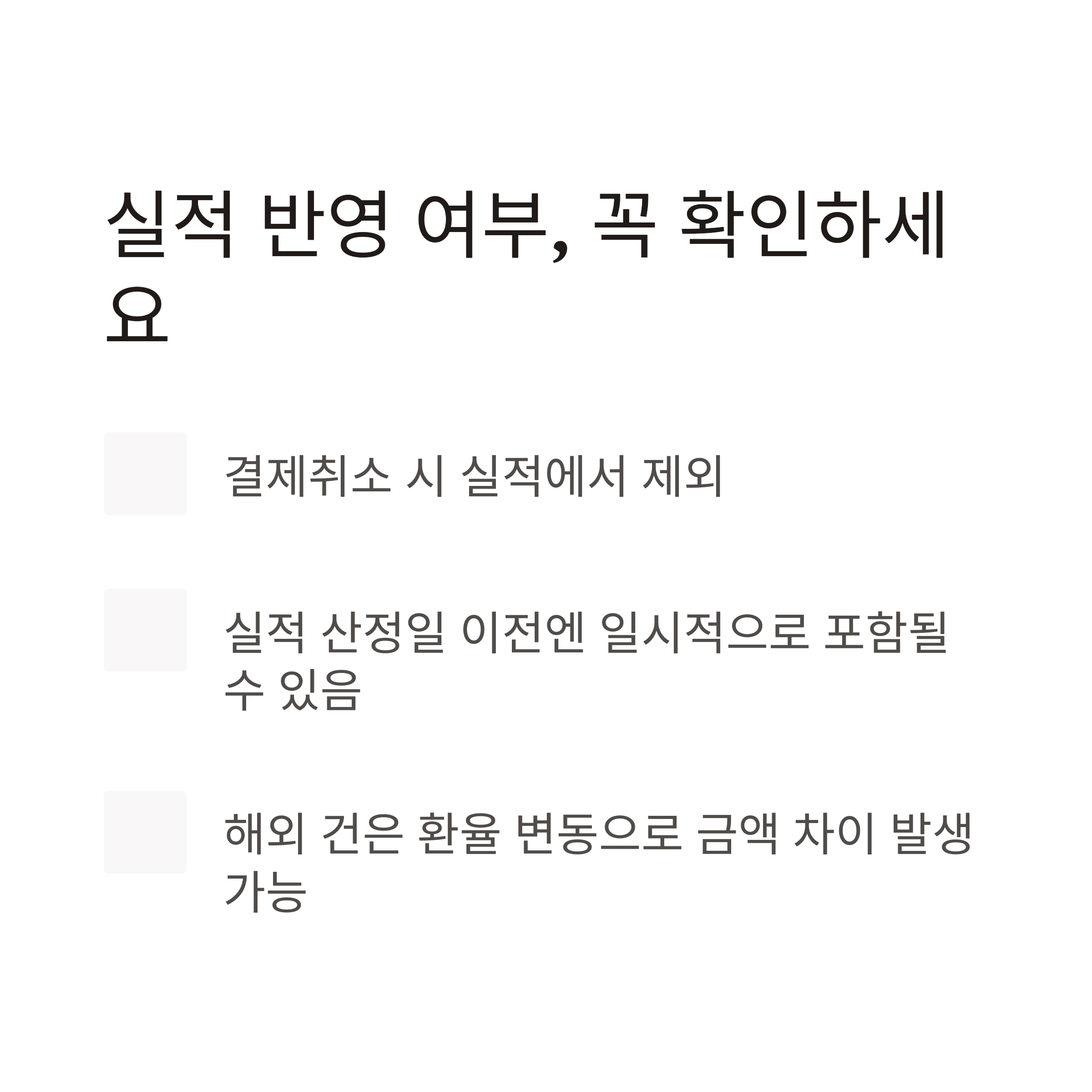 결제취소를 하고 나면 실적에 반영되는지도 궁금하시죠? 저 역시 포인트 적립이나 이벤트 기준 때문에 민감하게 확인했었는데요.