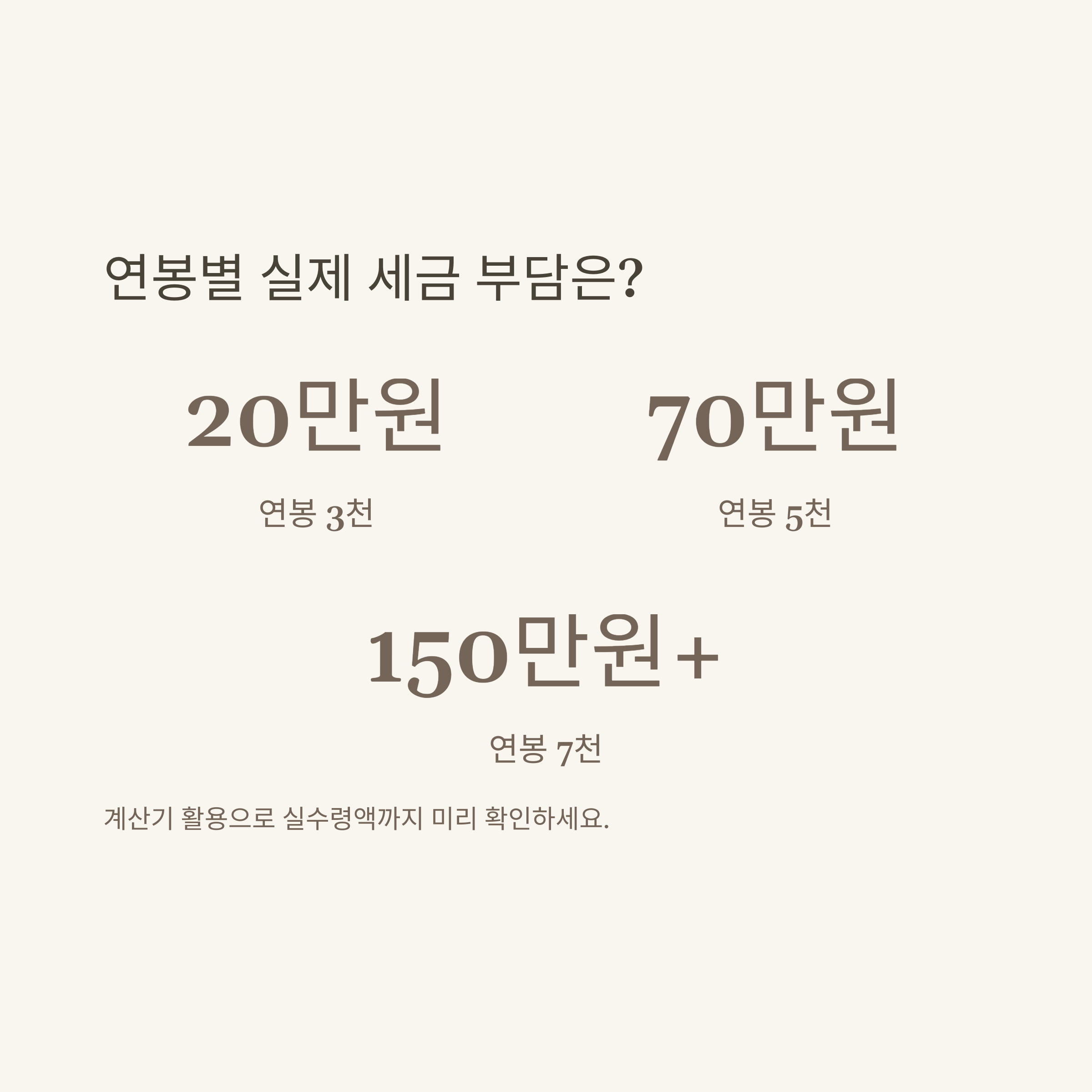 - 연봉 7,000만원: 공제 후 150만원 이상 소득세 부과