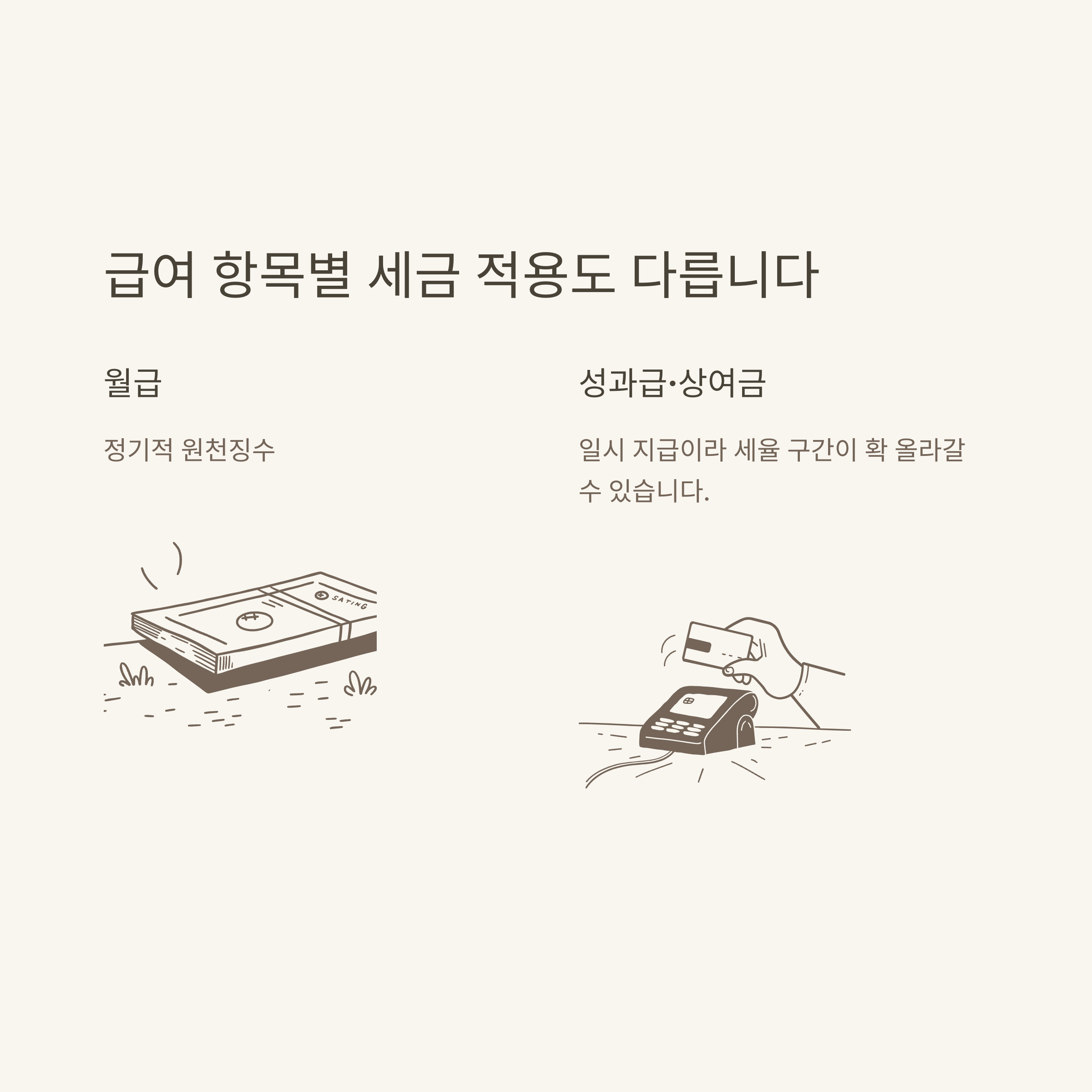- 성과급: 일시금으로 들어올 경우 누진세 구간 상승 주의
