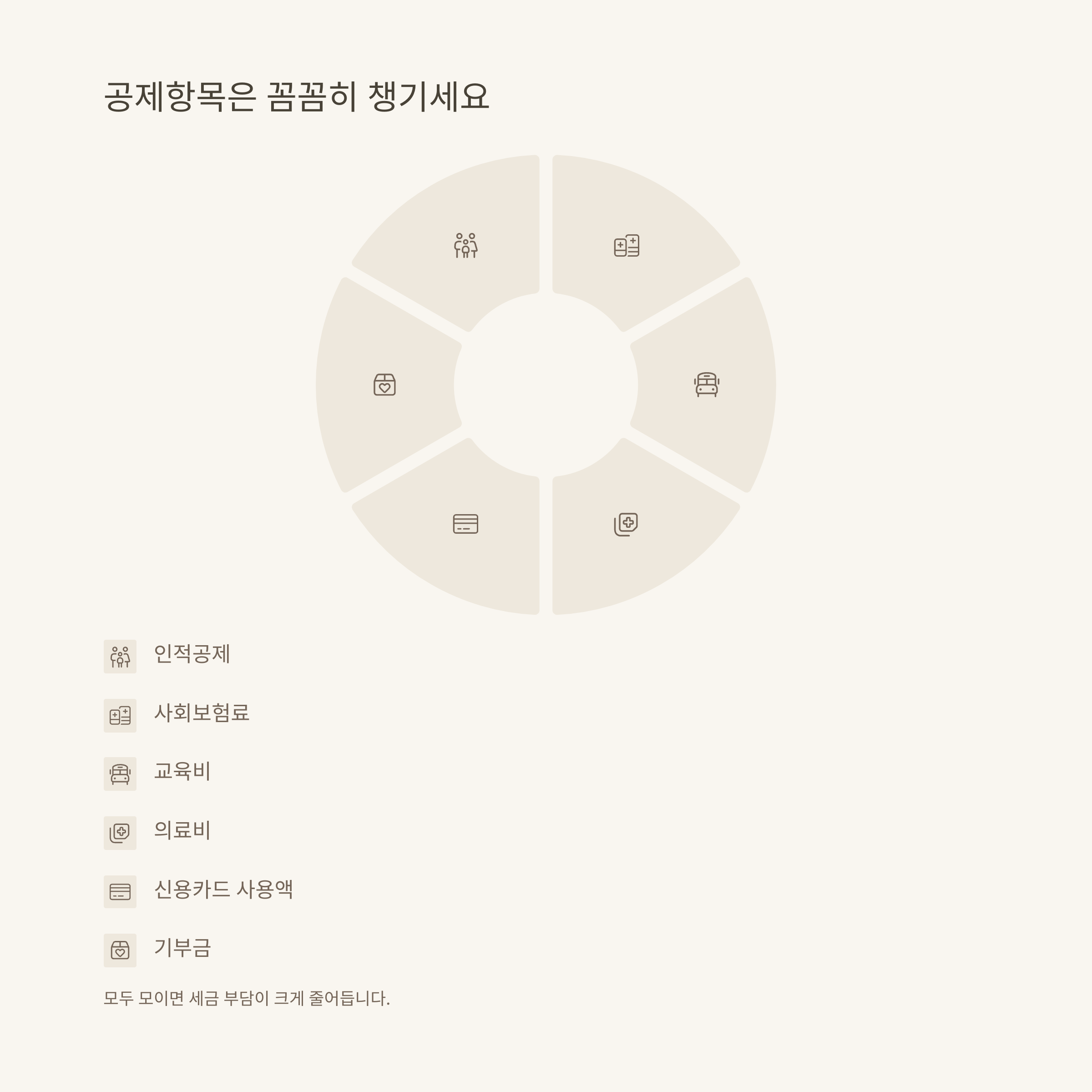 이처럼 다양한 공제항목을 빠짐없이 챙기면 실제 근로소득세 부담을 크게 줄일 수 있습니다. 최신 공제 정보와 한도는 국세청 공식 안내에서 꼭 확인하세요.