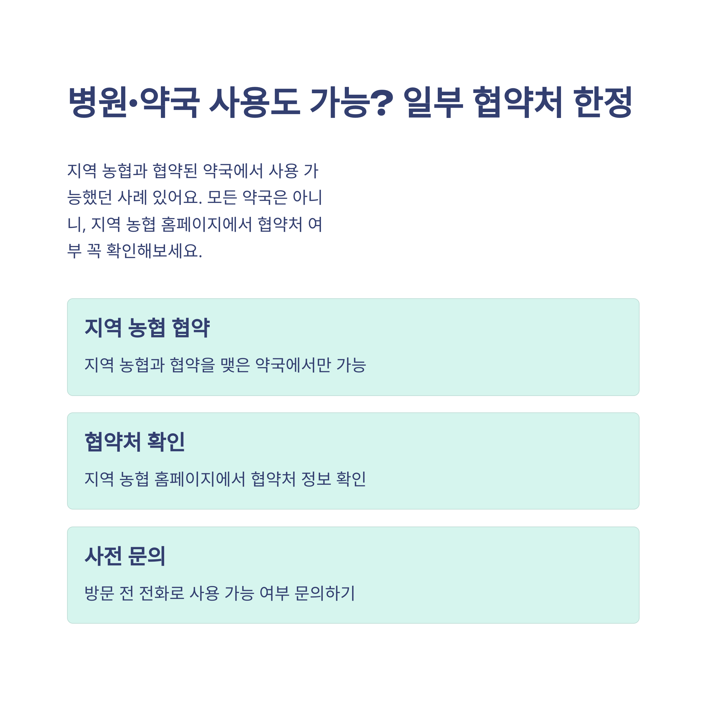 저는 지역 농협에서 체결한 협약 약국에서 농협상품권 사용 경험이 있어요. 약국에서 “농협상품권 되나요?”라고 물었더니, 승인 후 정상 결제되었습니다. 단, 모든 약국이 가능한 건 아니며, 제 경험은 협약 약국에 국한됩니다. 사전에 지역 농협 웹사이트에서 ‘협약처’를 꼭 확인하세요.