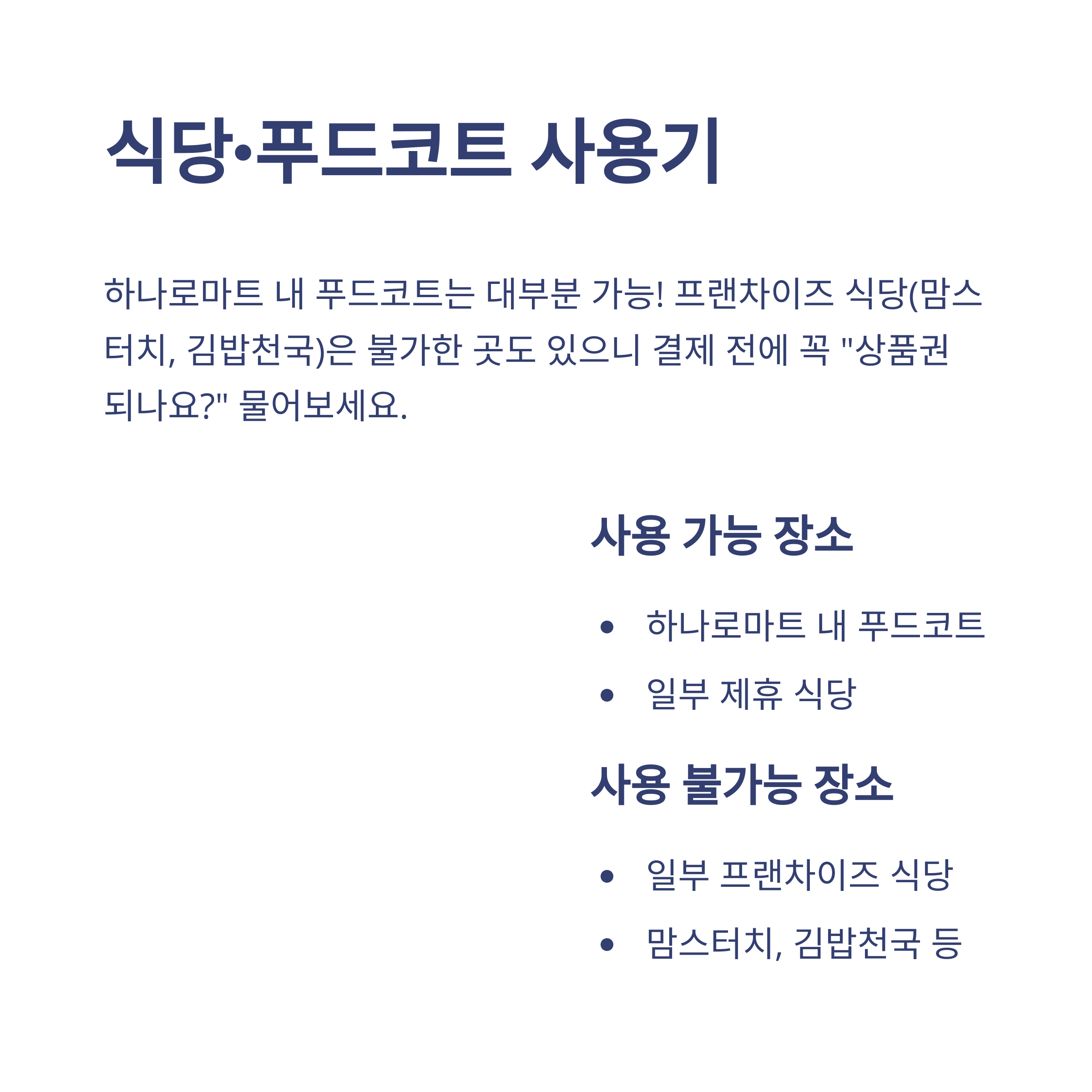 명절 지나고 하나로마트 내 푸드코트에서 농협상품권으로 식사한 적 있습니다. 매장 디스플레이에 ‘상품권 결제 가능’ 안내가 있었고, 직원분들도 익숙한 모습이었어요. 반면, 맘스터치나 김밥천국 같은 프랜차이즈에서는 거절당한 적 있어요. 결제 전 반드시 “농협상품권 가능하냐” 직접 물어보는 것이 중요합니다.