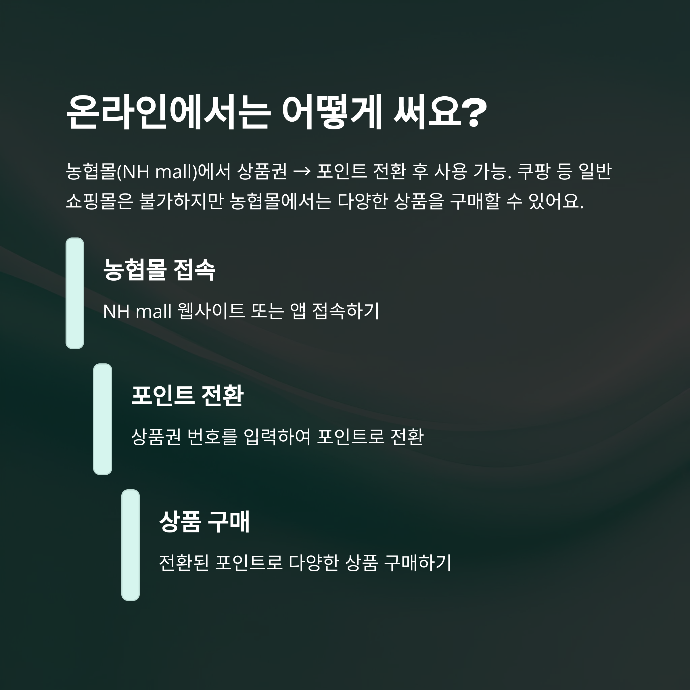 제가 농협몰(NH mall)에서 상품권을 포인트로 전환해 사용한 적이 있습니다. 상품권 번호를 입력하면 즉시 포인트가 적립되고, 그 포인트로 농협몰에서 쇼핑할 수 있었어요. 쿠팡 등 일반 쇼핑몰에서는 사용할 수 없지만, 농협몰에서는 충분히 온라인 쇼핑도 가능합니다.