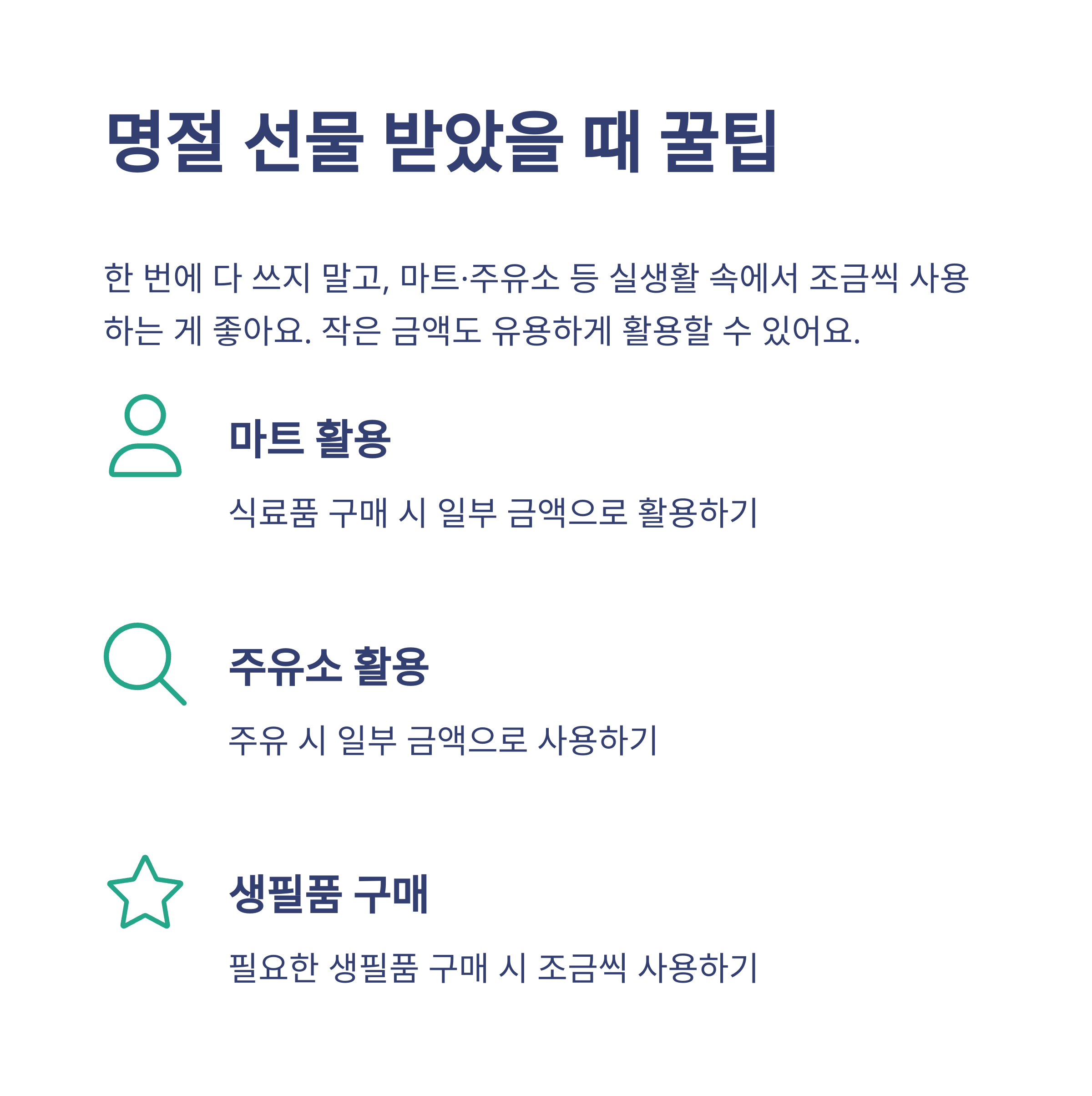 저는 농협상품권을 명절 선물로 선호하는데, 받는 입장에서는 어디서 사용할지 고민이 되더라고요. 그래서 저는 받은 상품권을 한 번에 사용하기보다, 주유소나 하나로마트 등에서 소액으로 나눠 사용하는 전략을 씁니다. 이렇게 하면 잔액도 효율적으로 관리되고, 소모 스트레스도 줄어듭니다.