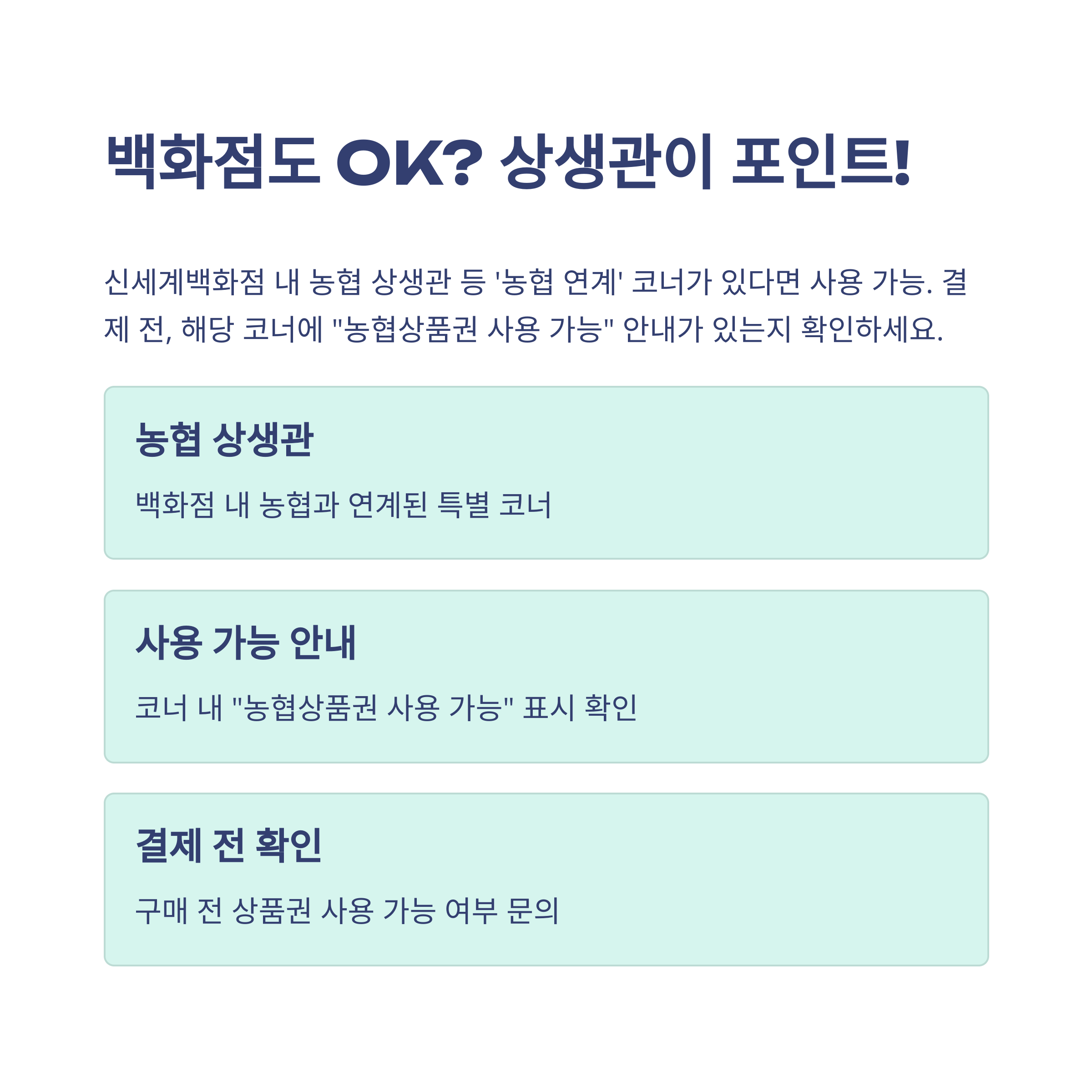 저는 신세계백화점 강남점에서 지역특산물 코너(‘농협 상생관’)을 발견해 농협상품권으로 결제해본 경험이 있어요. 일반 백화점은 사용이 되지 않지만, ‘농협 연계 매장’은 가능하다는 뜻을 실제로 느꼈습니다. 결제 전 해당 코너에서는 “농협상품권 사용 가능” 스티커를 붙여 두는 경우가 많아 한 번만 확인해도 금방 알 수 있었어요.