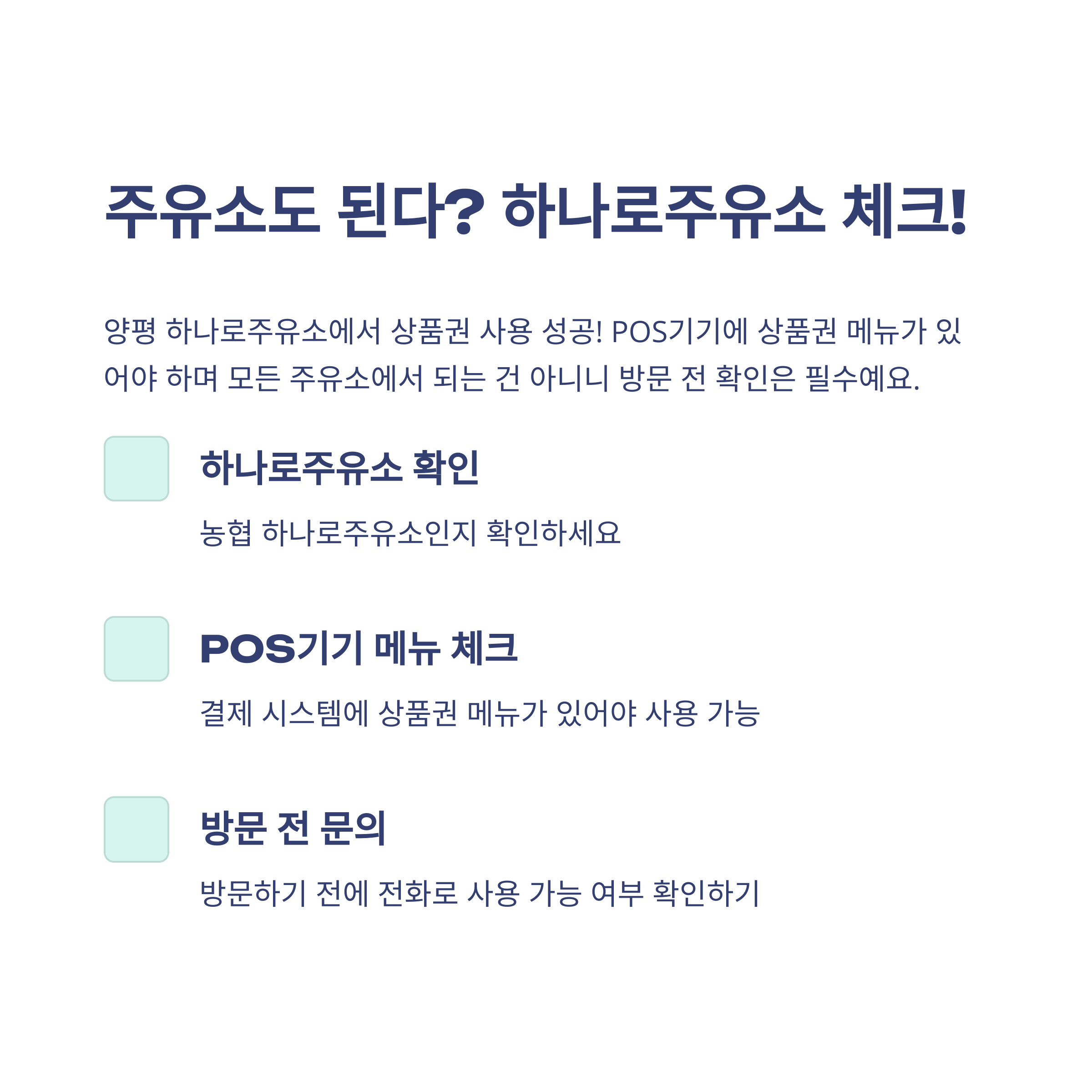 저는 자동차 유류비로 사용하려고 양평 하나로주유소를 찾았는데, POS 기계에 ‘상품권’ 메뉴가 있어 바로 결제할 수 있었습니다. 단, 모든 주유소가 아니니 한 번 더 확인이 필수였습니다. 아래 짧은 체크리스트를 활용하세요: