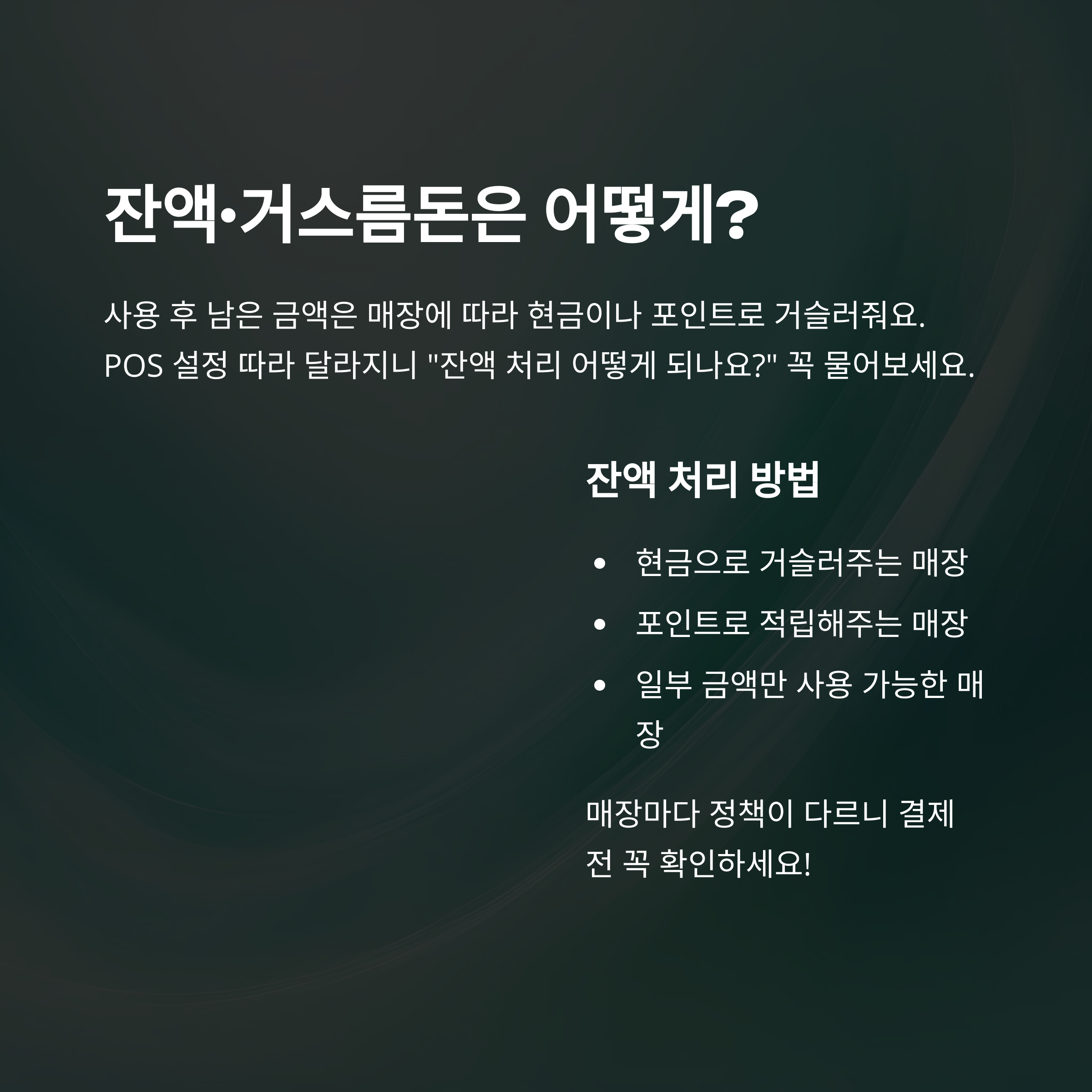 저는 한 번 상품권 일부만 사용하고 잔액이 남았을 때 고민했었어요. 보통은 POS에서 현금 또는 포인트로 거슬러주는데, 매장마다 다릅니다. 거스름돈 받을 때는 “잔액 한 번 확인해 주시겠어요?”라고 요청하세요. 일부 매장은 현금 대신 포인트로 돌려주는 경우도 있으니 정확히 확인하는 것이 중요합니다.