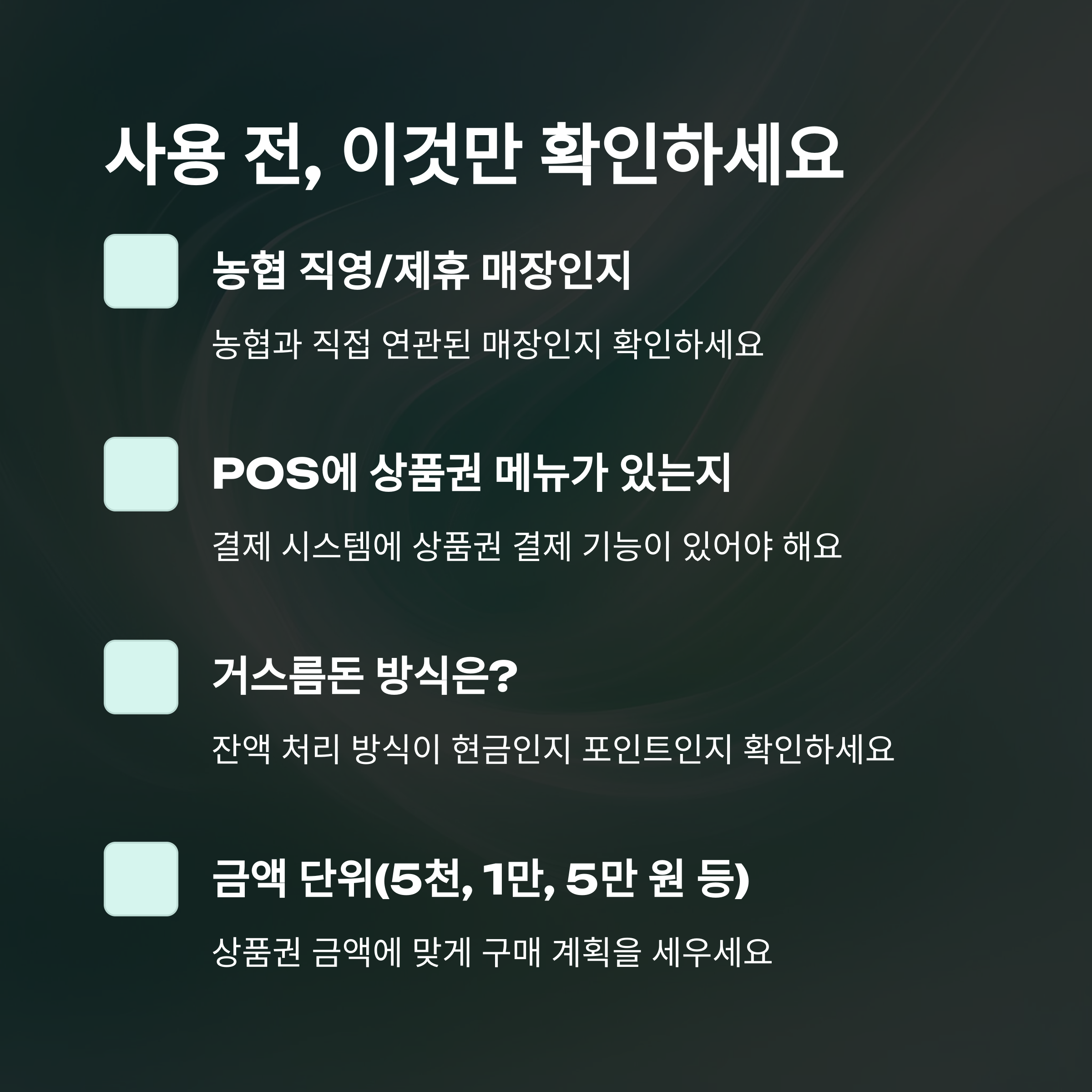 상품권을 들고 나가기 전에 아래 사항만 확인해도 헛걸음 줄일 수 있습니다: